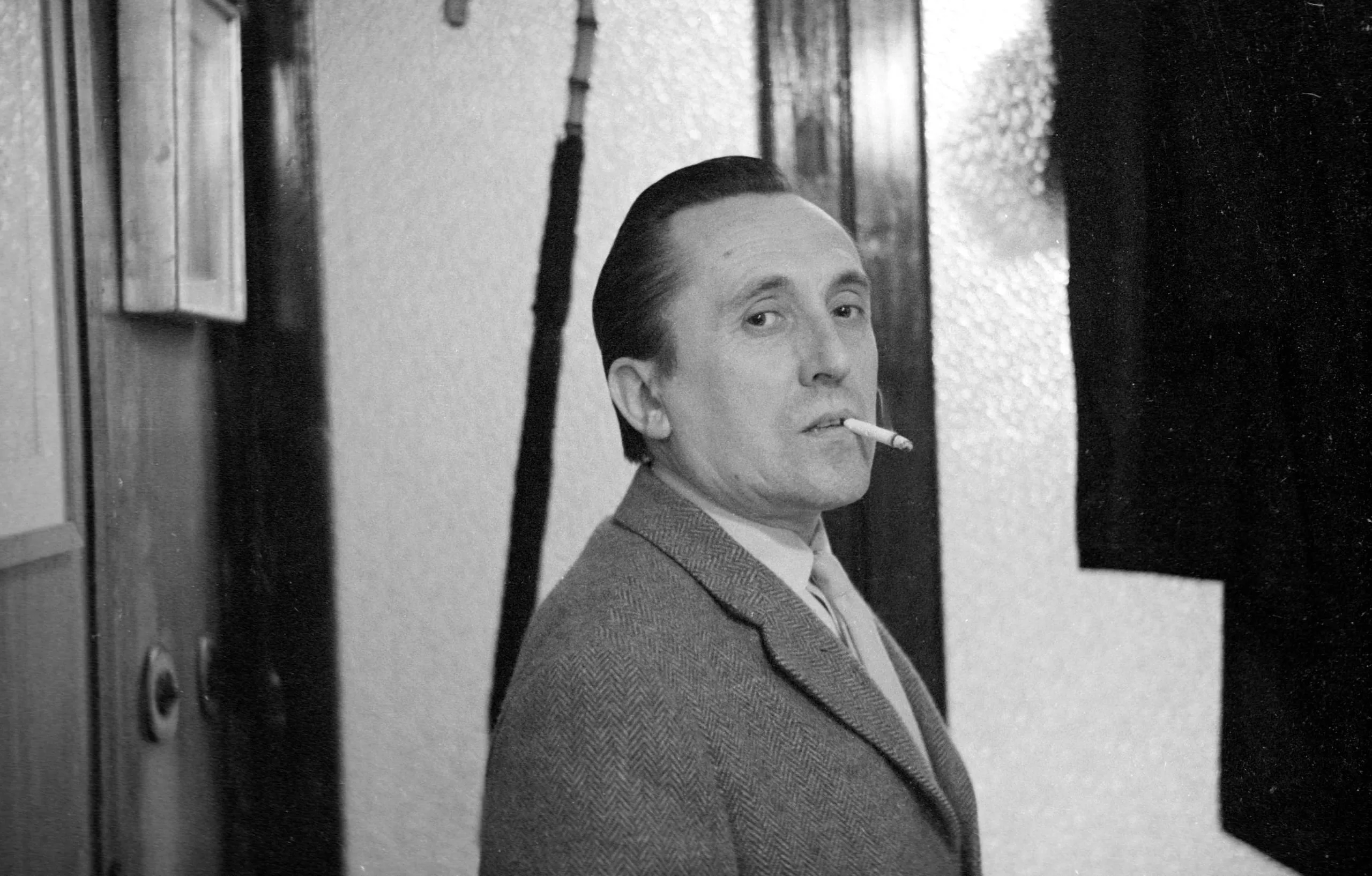Black and white photograph, man from the chest up in a herringbone coat, cigarette between his lips, turning to look back over his shoulder