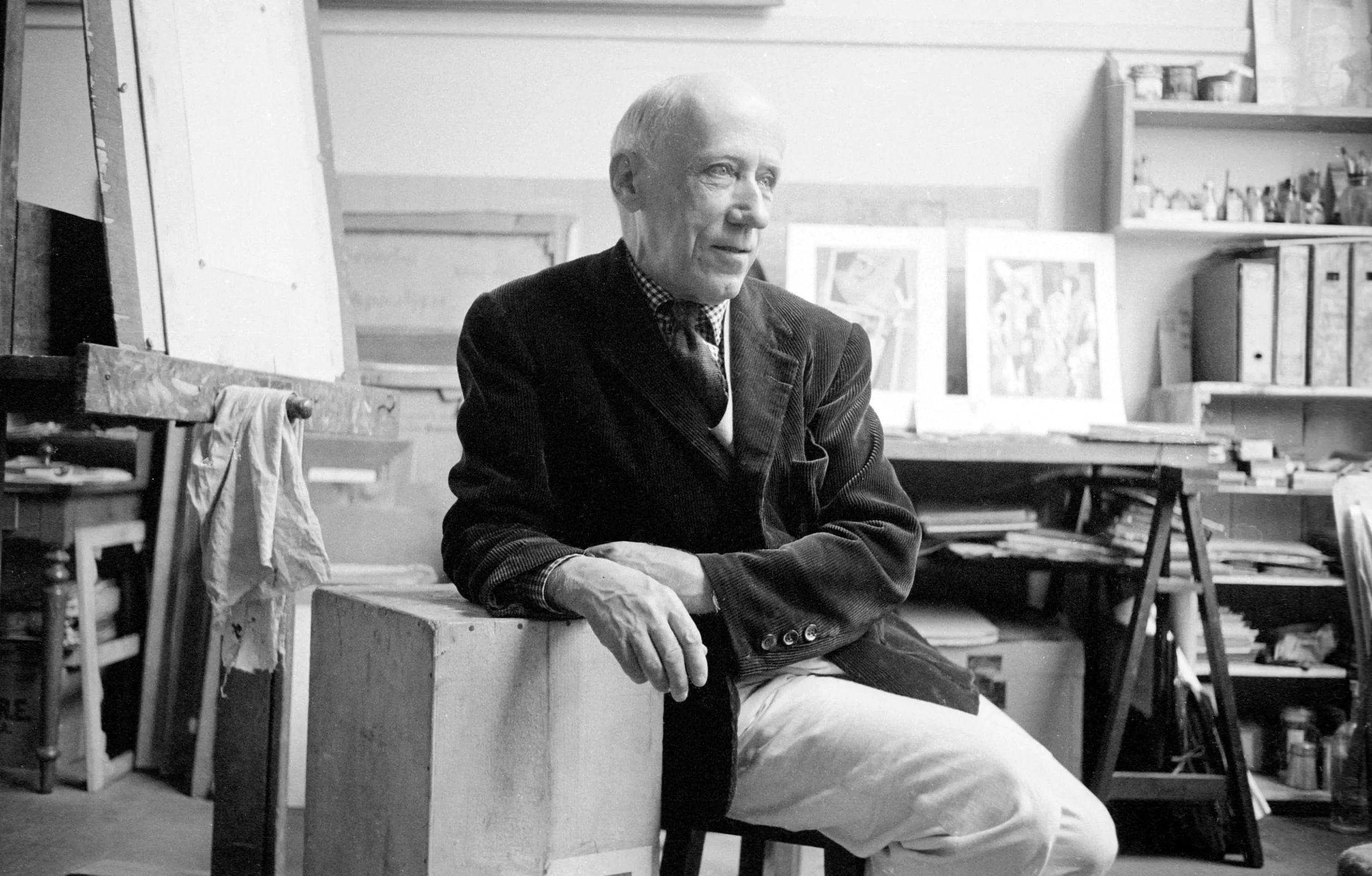 Black and white photograph of an older man in a dark blazer seated in an artist's studio, looking to the left, surrounded by artworks and shelves