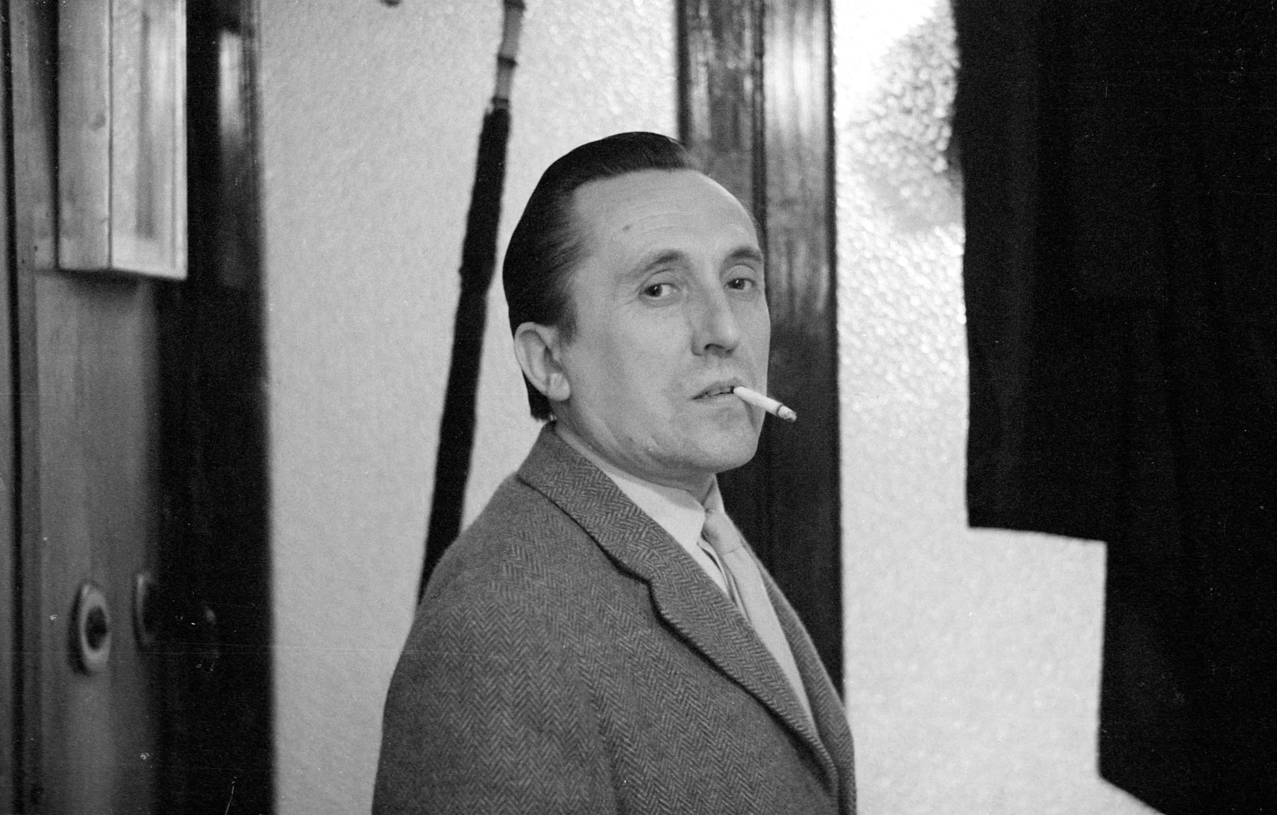 Black and white photograph, man in herringbone overcoat, three-quarter view, cigarette in mouth, looking directly at camera