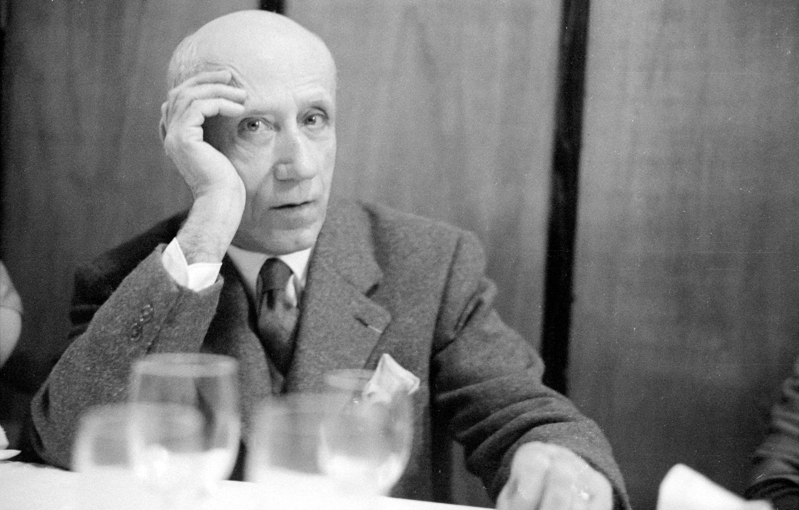 Black and white photograph of a bald white man in a gray suit and dark tie, seated at a table, resting his face on his fist, looking to the right