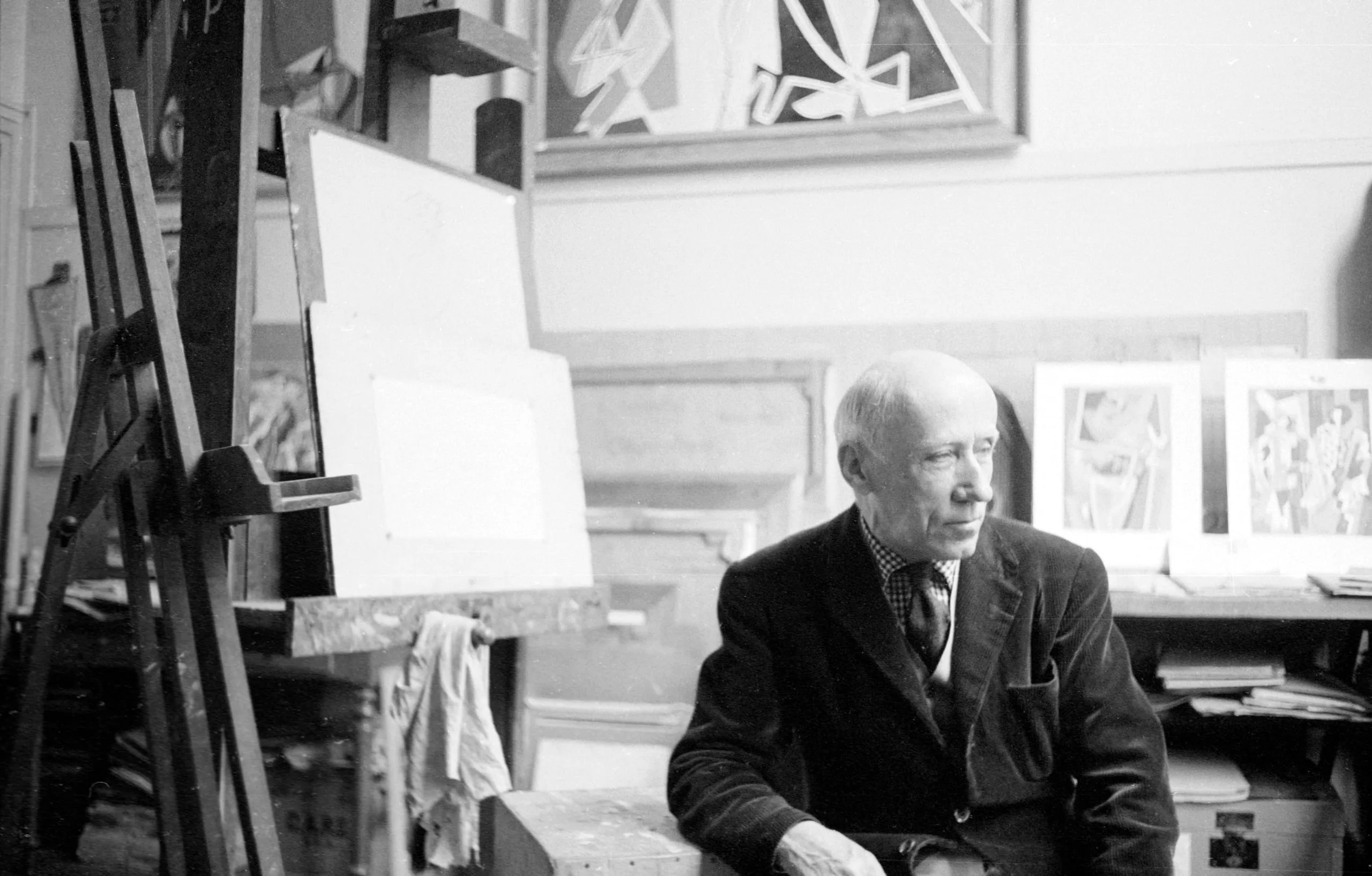 Black and white photograph of an elderly man seated in a cluttered artist's studio, surrounded by canvases, an easel, and framed works on the wall