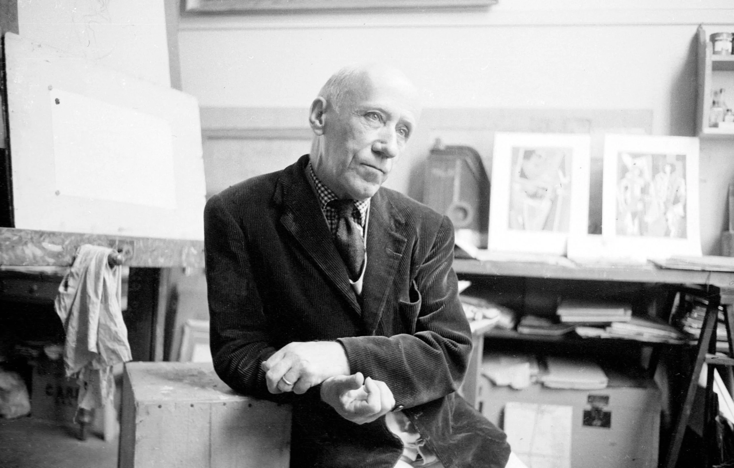 Black and white photograph of an older white man seated in an artist's studio, body angled slightly right, hands clasped, with framed artworks visible on a worktable behind him