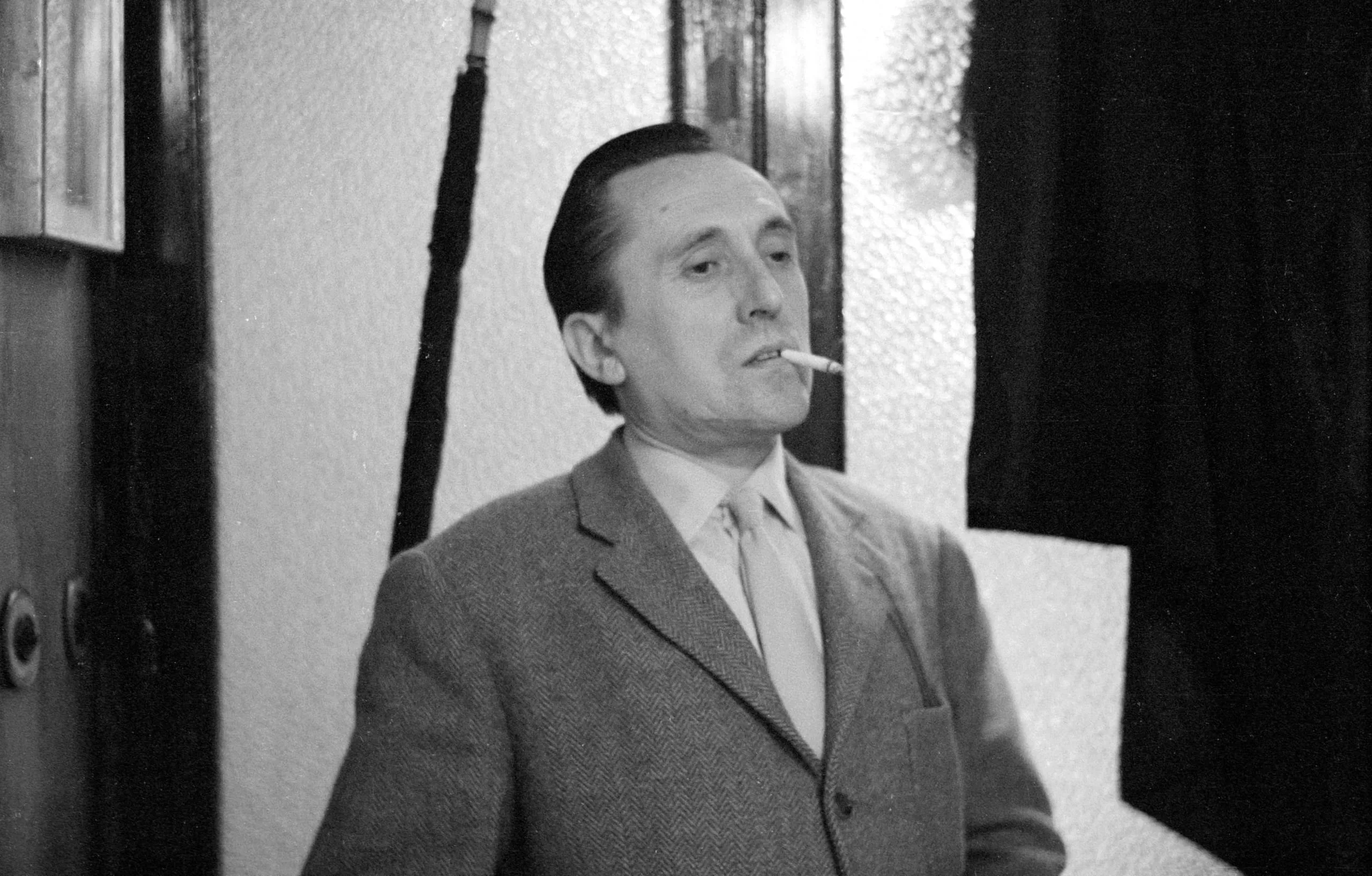 Black and white photograph of a man from the waist up, body angled left, looking upward with a cigarette between his lips, wearing a tweed sport coat and striped tie