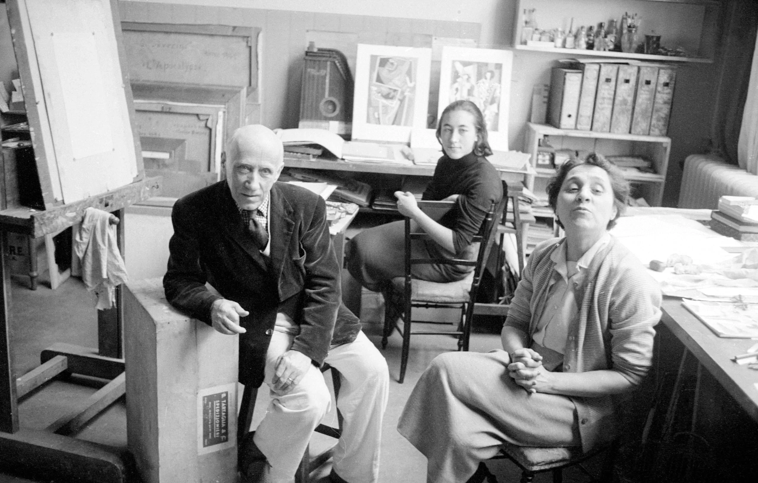 Black and white photograph of three people in an artist's studio — an older bald man leaning on a wooden crate and two women seated nearby, surrounded by framed artworks and shelves