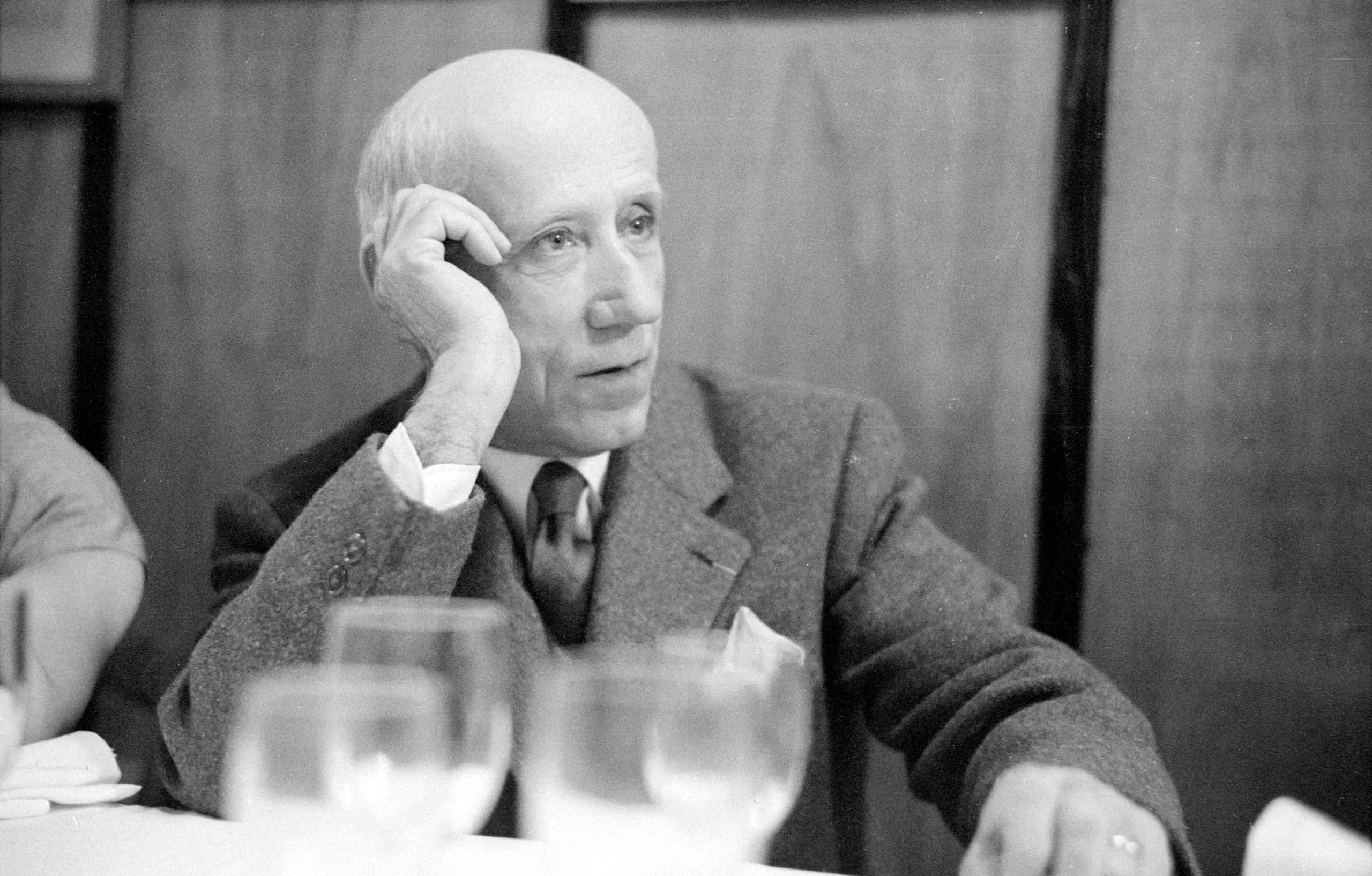 Black and white photograph of a bald, white-haired man in a tweed suit seated at a table, resting his cheek against his raised right hand, looking to the right
