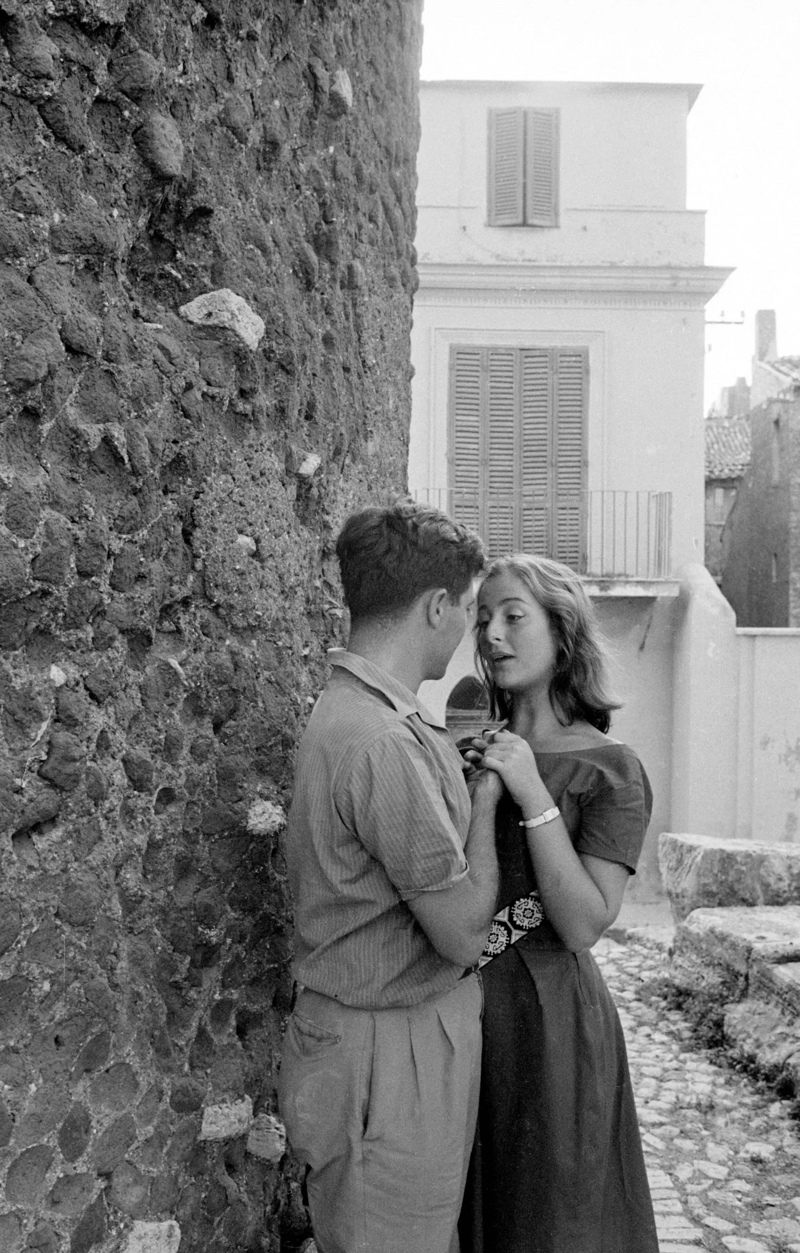 Black and white photograph of a young man and woman standing close together against a rough stone wall on a cobblestone street, with shuttered buildings visible in the background