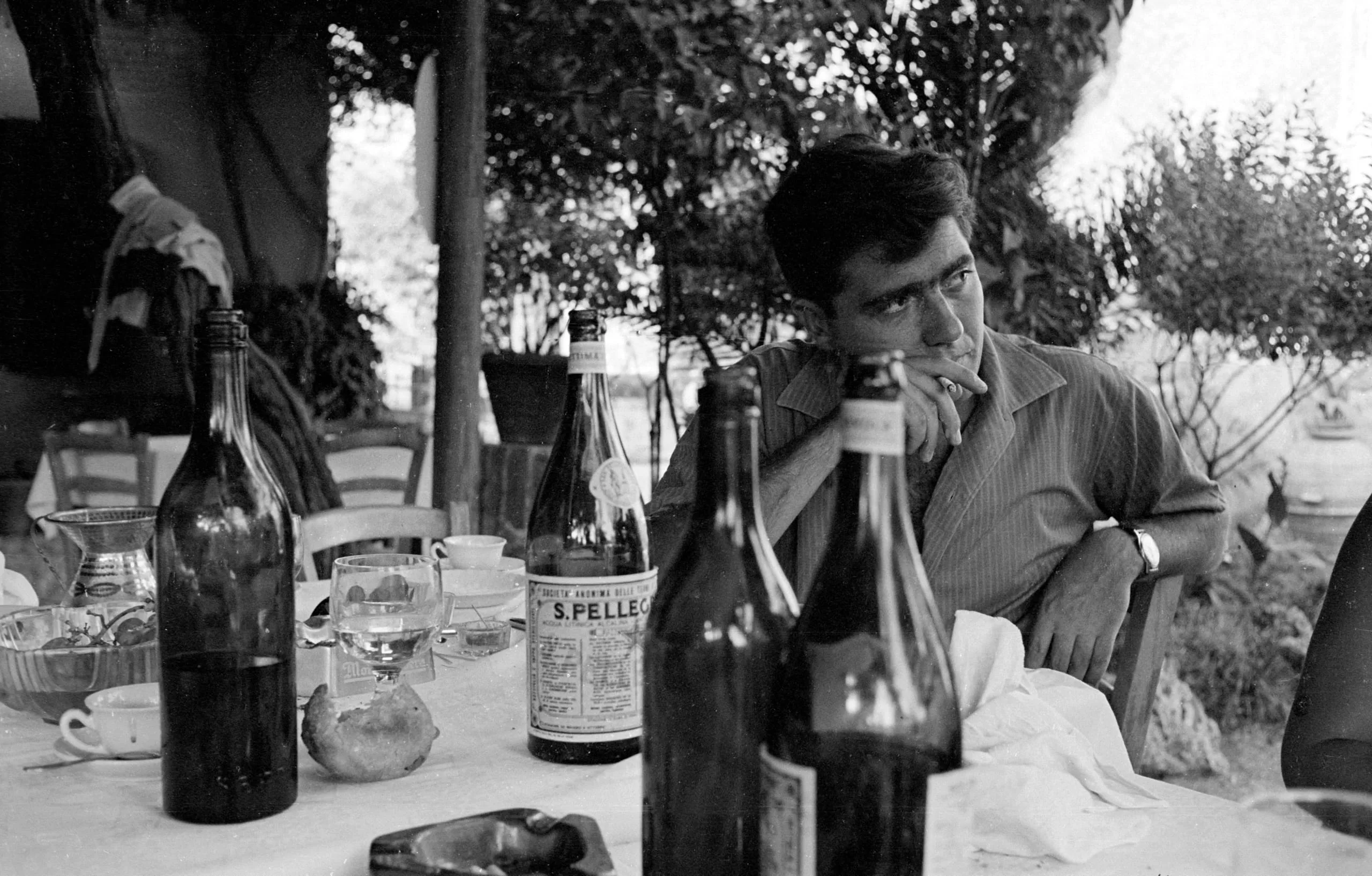 Black and white photograph of a dark-haired man seated at a cluttered outdoor table with wine and San Pellegrino bottles, holding a cigarette