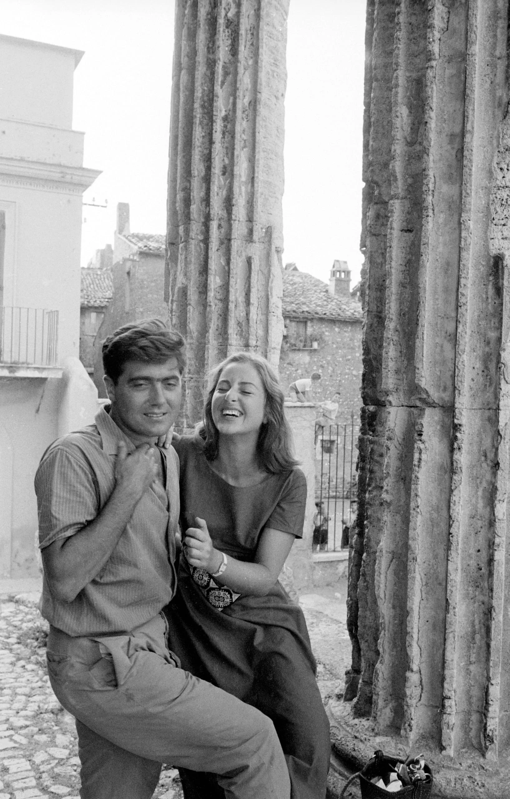 Black and white photograph of a man seated and a woman leaning against him, both laughing, posed between two large weathered stone columns in an Italian-looking town square