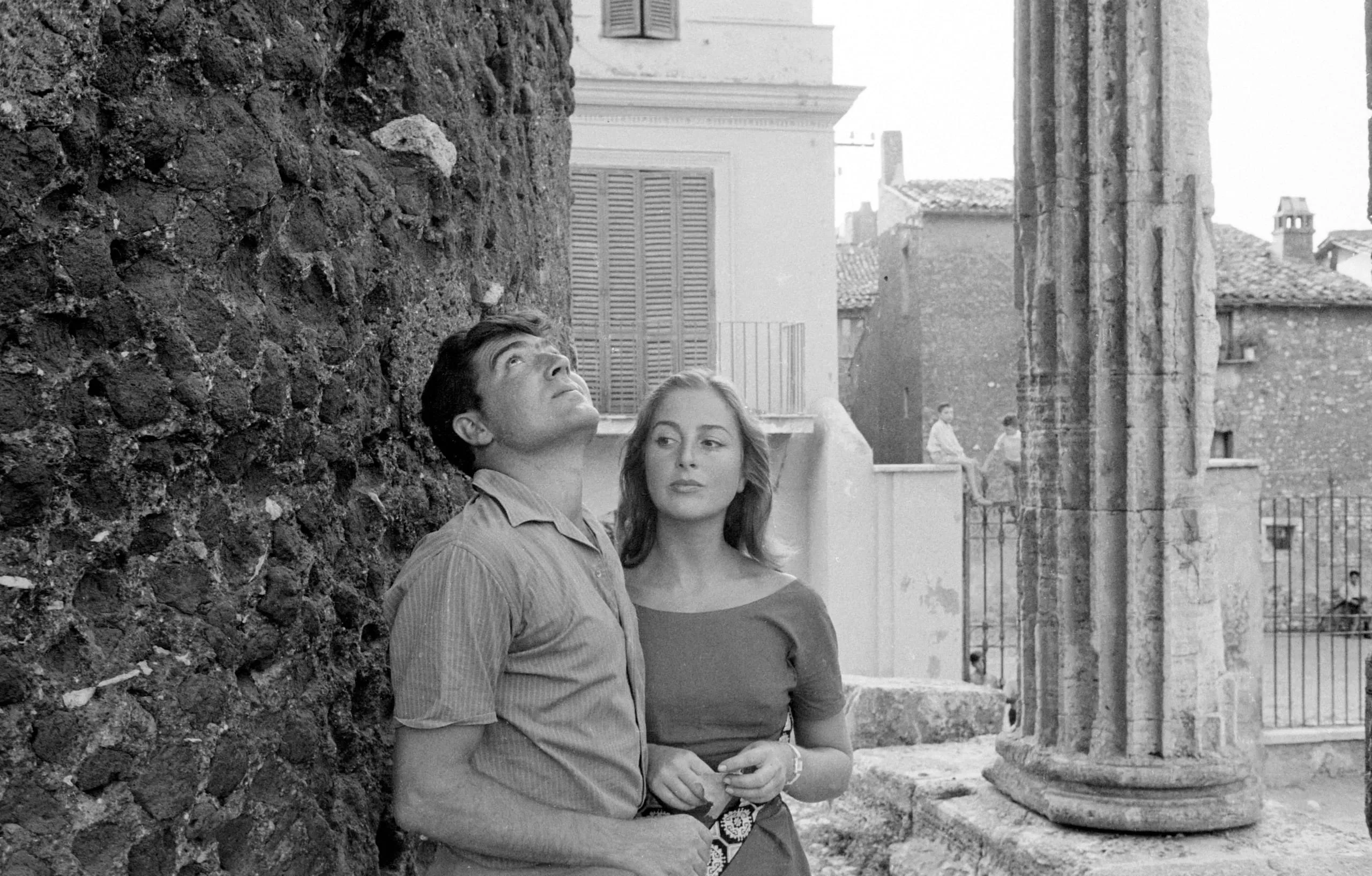 Black and white photograph of a man and woman standing together against a rough stone wall, with an ancient fluted column and Italian buildings visible behind them