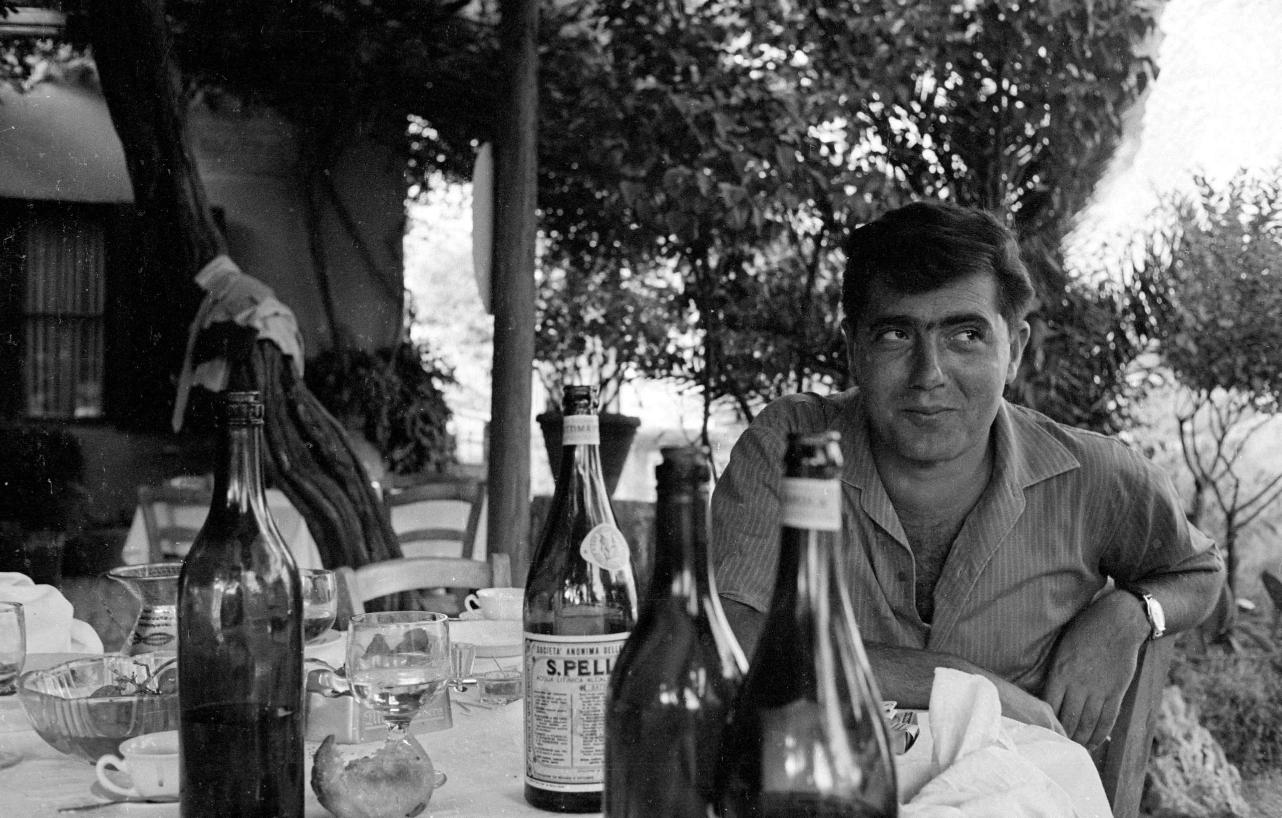Black and white photograph of a dark-haired man seated at an outdoor table with wine bottles and glasses, looking past the camera