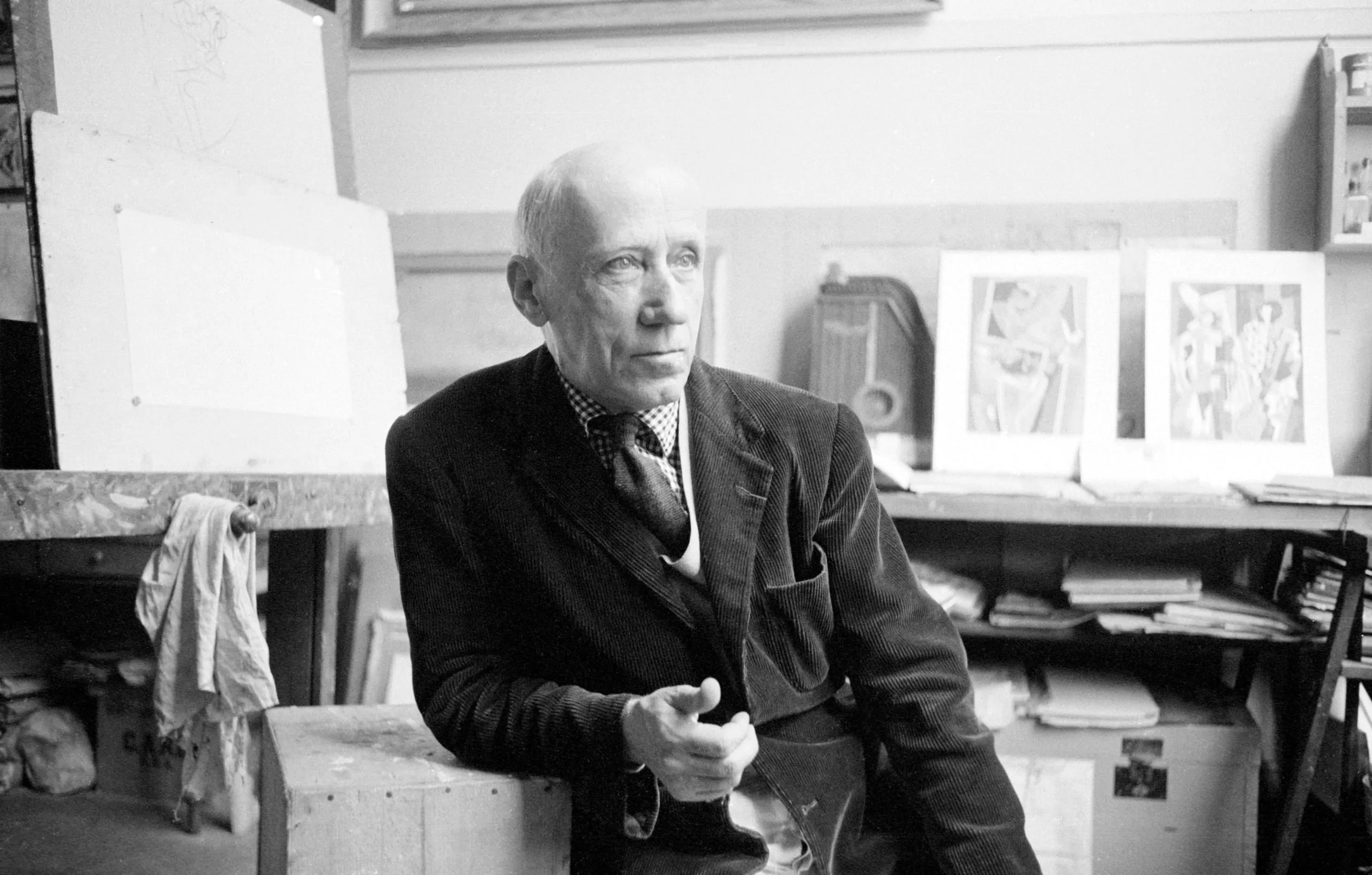 Black and white photograph of an elderly man seated in an artist's studio, body angled left, hands clasped, surrounded by canvases and a cluttered worktable