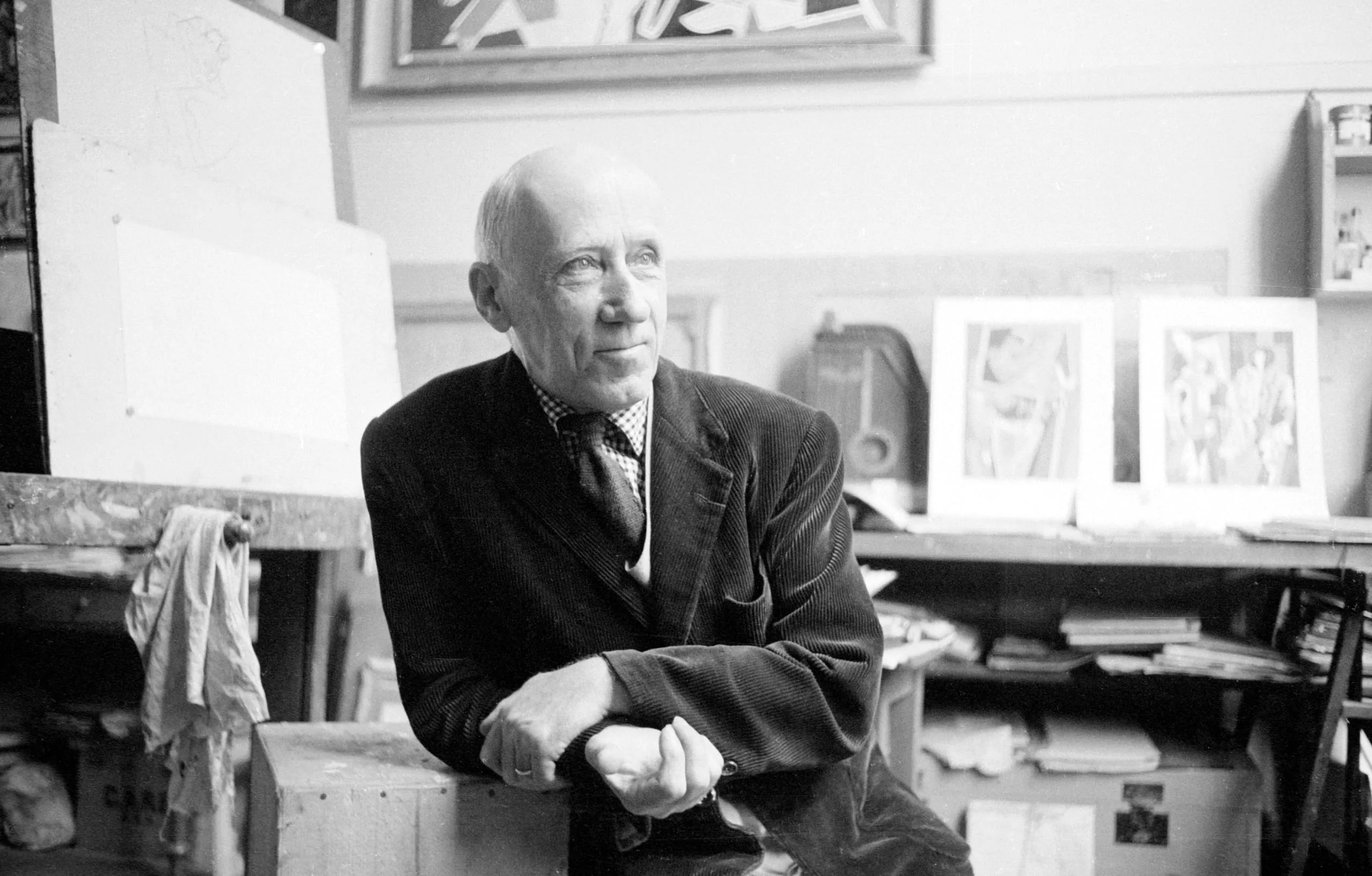 Black and white photograph of an elderly bald man in a dark blazer seated in an artist's studio, arms resting on a wooden surface, looking to the left