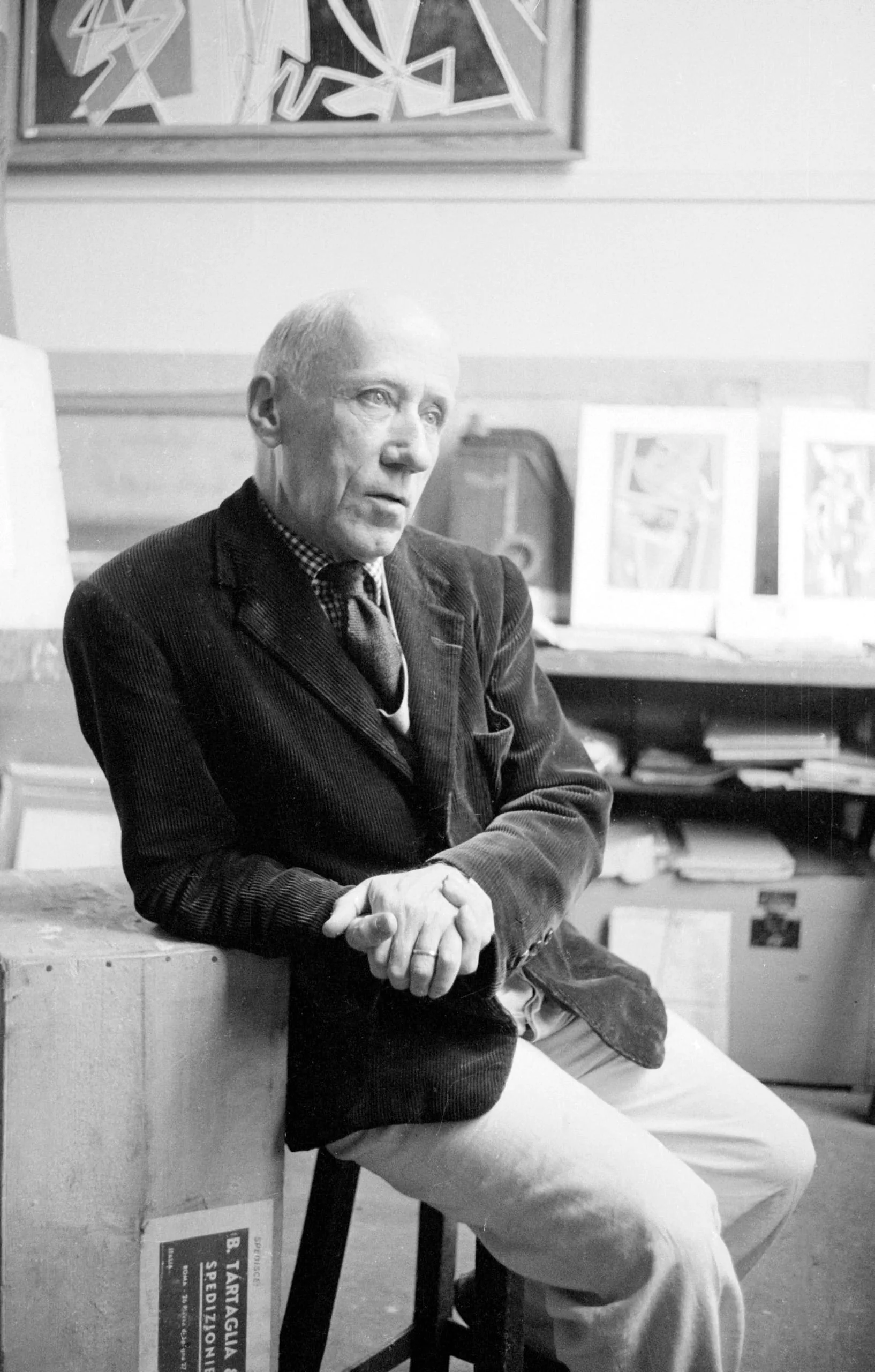 Black and white photograph of an older man in a corduroy jacket seated on a stool in an artist's studio, hands clasped, looking up and to his right
