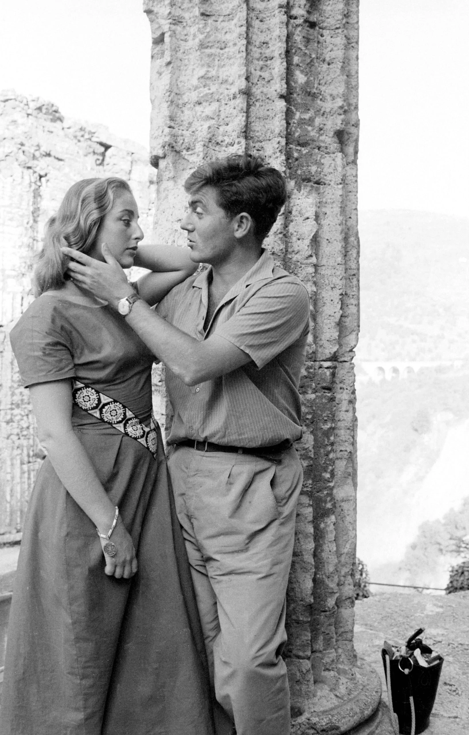 Black and white photograph, a man and woman in 1950s clothing stand close together beside a weathered stone column amid ancient ruins, soft outdoor lighting