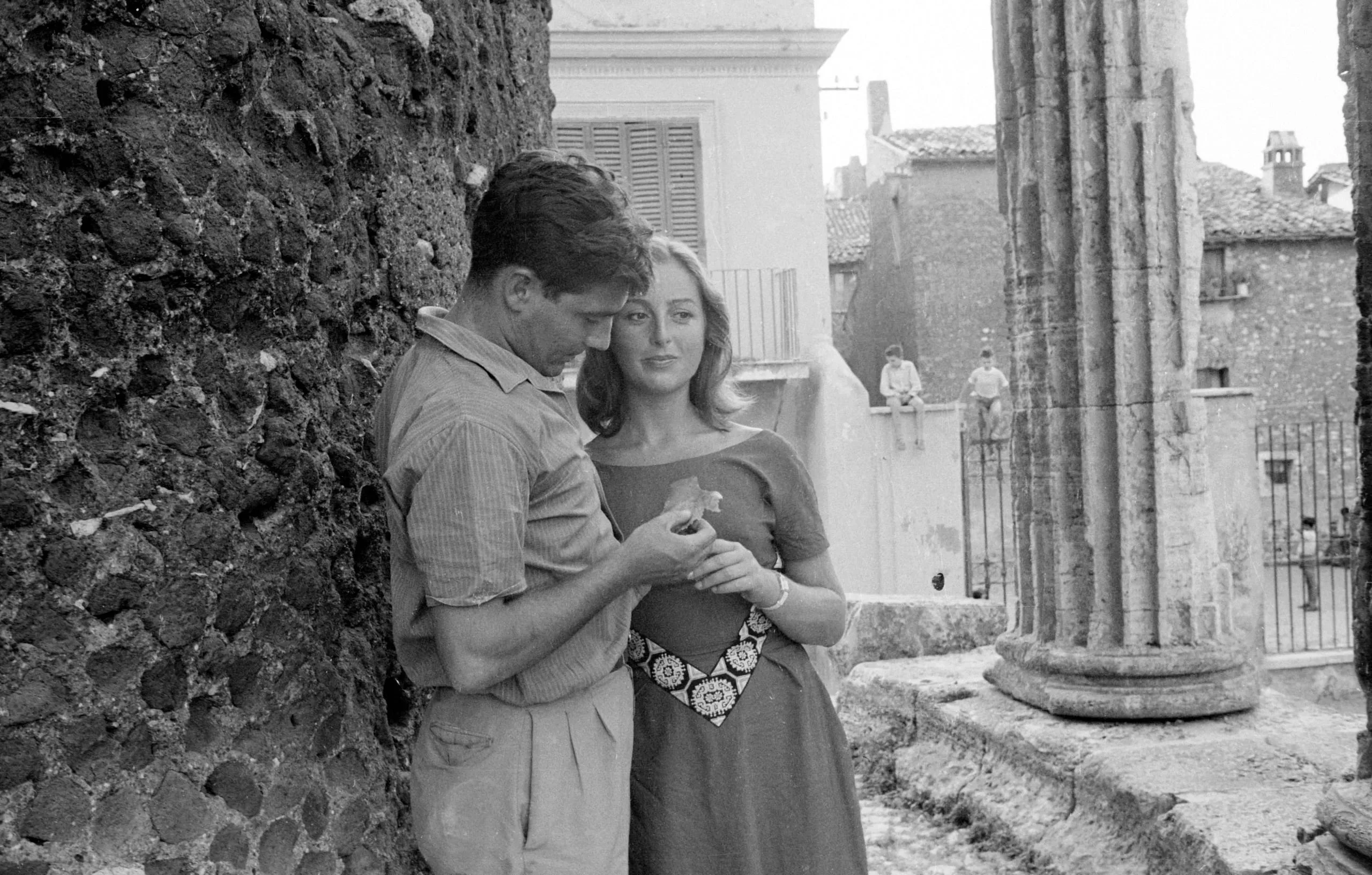 Black and white photograph of a man and woman standing close together against a rough stone wall, with ancient columns and Italian buildings in the background