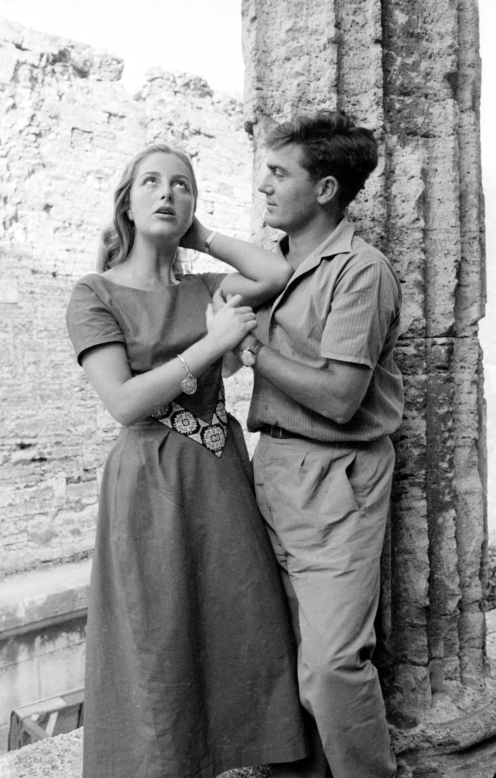 Black and white photograph of a woman and man standing before ancient stone ruins, she looks upward while he reaches toward her face