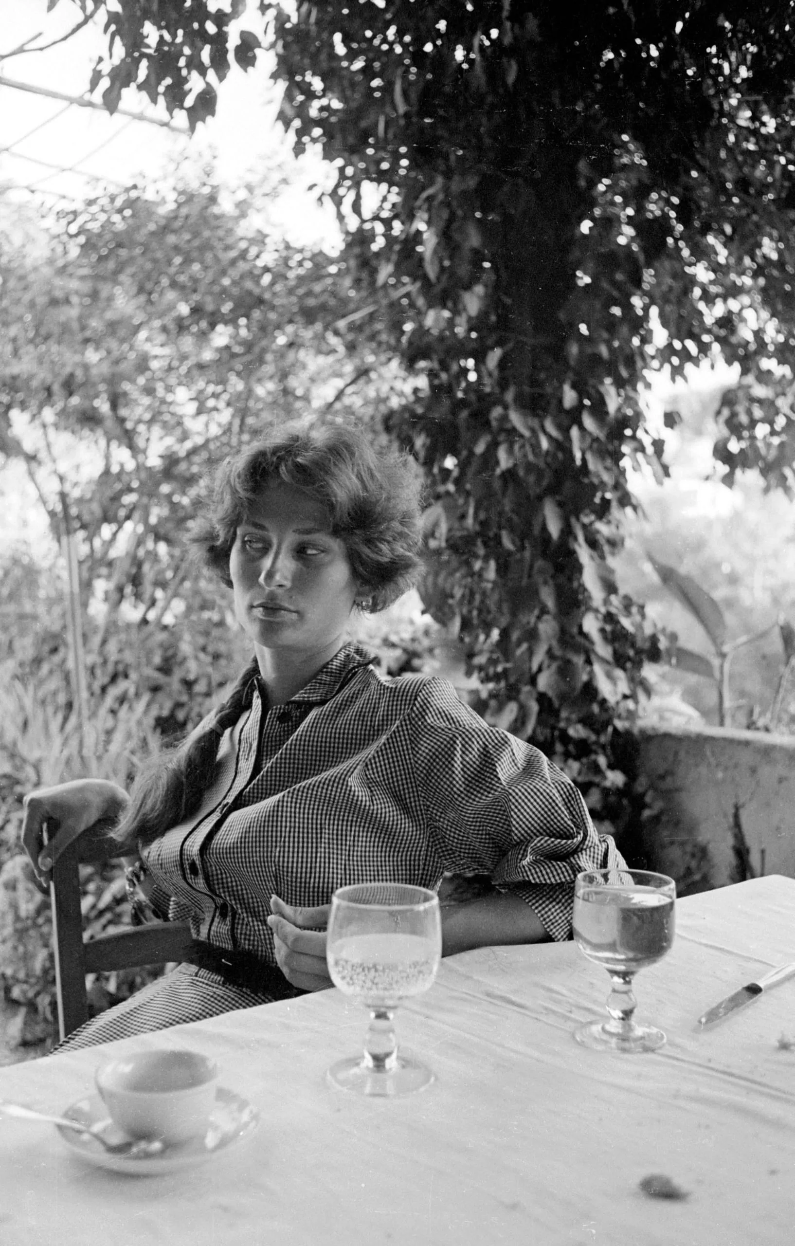 Black and white photograph of a woman in a gingham shirt seated at an outdoor table with wine glasses and a coffee cup, leafy trees behind her