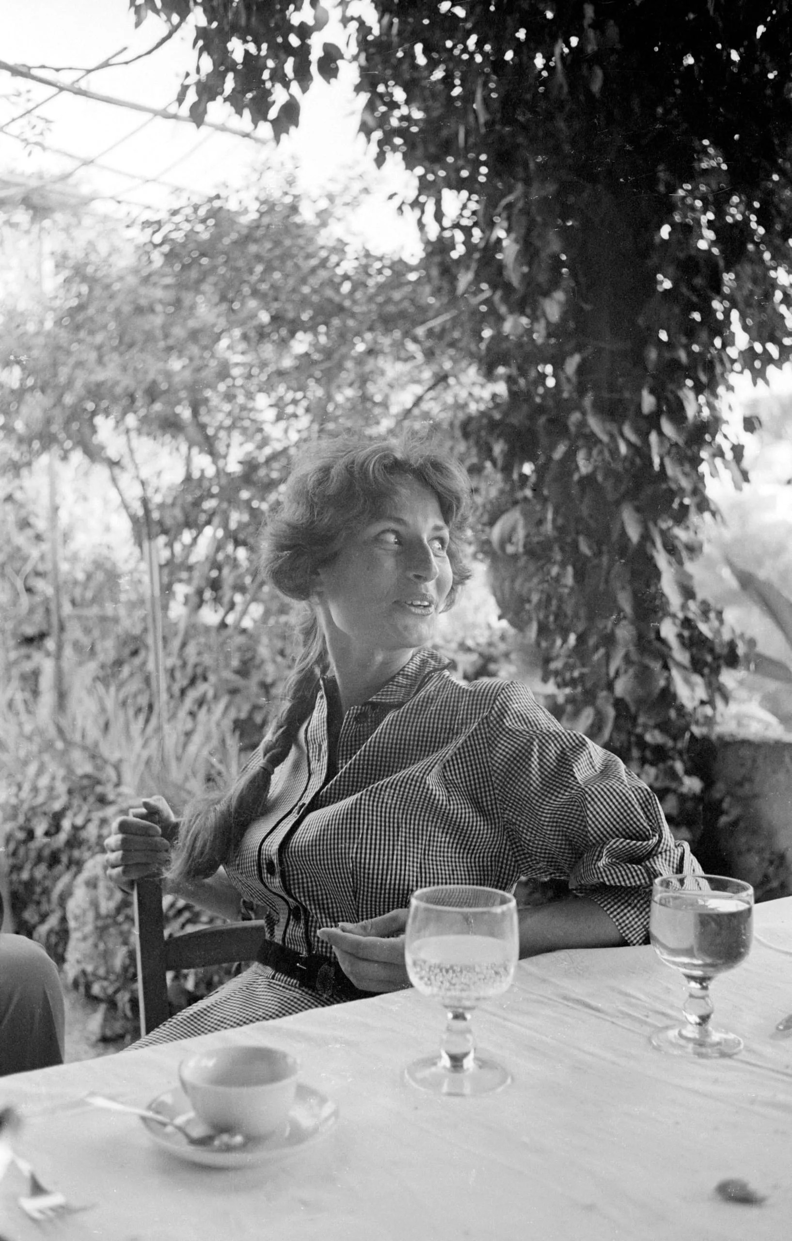 Black and white photograph of a woman in a checkered blouse seated at an outdoor table, looking up and to the left, with leafy trees behind her
