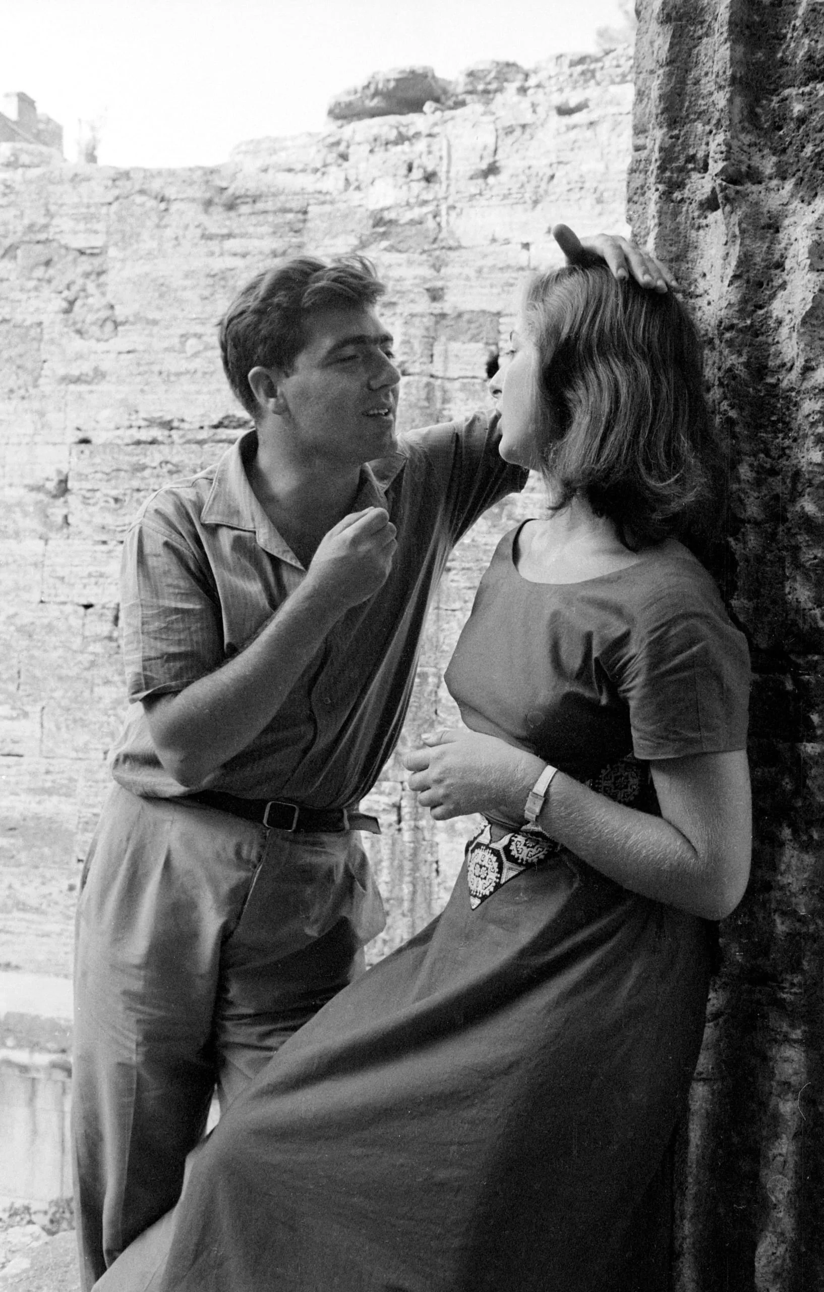 Black and white photograph of a man and woman standing close together against a stone wall, the man resting his hand on her head and smiling down at her