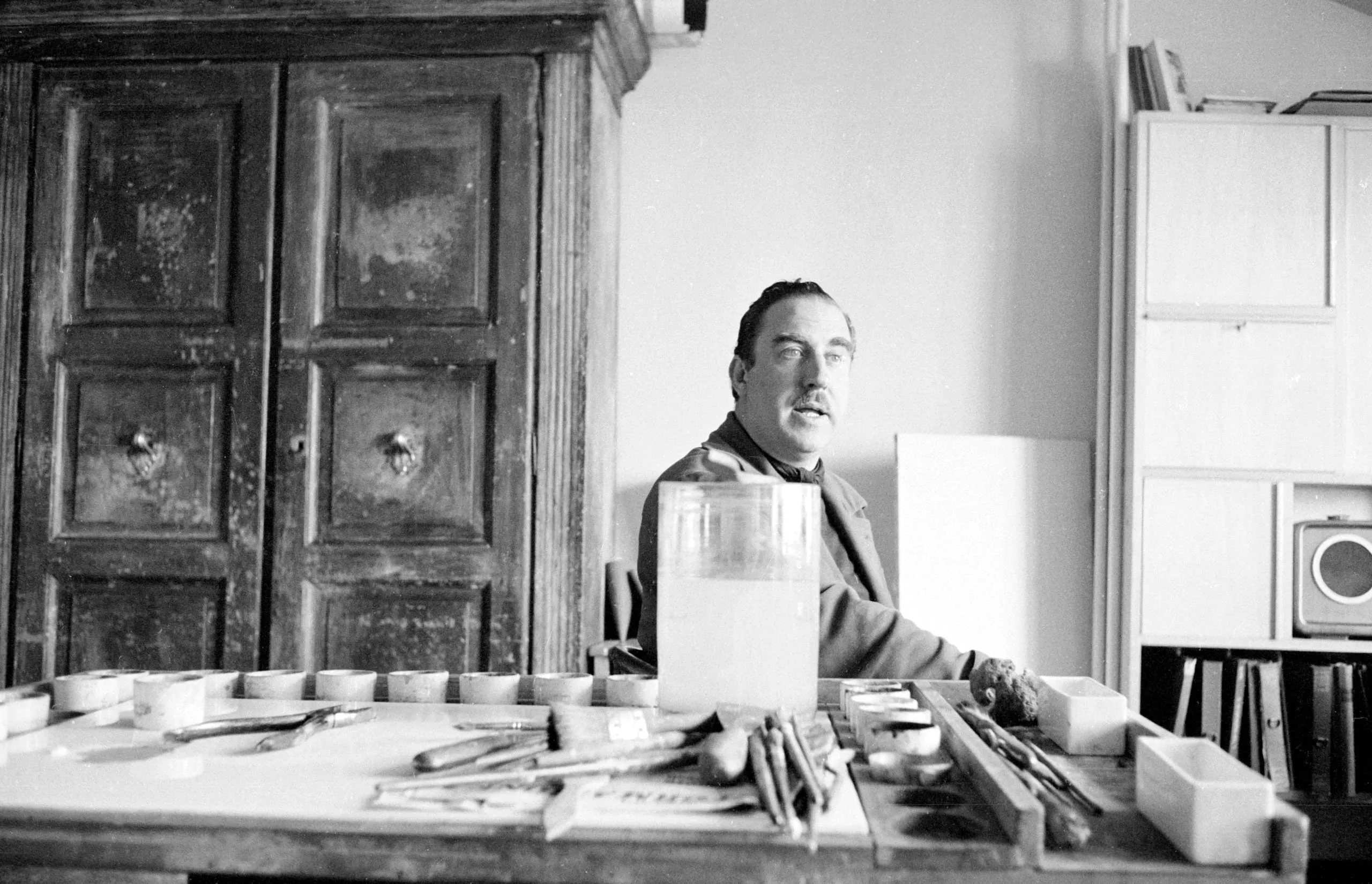 Black and white photograph of a man with a mustache seated behind a worktable scattered with paintbrushes, palette knives, and trays, a large glass jar in front of him