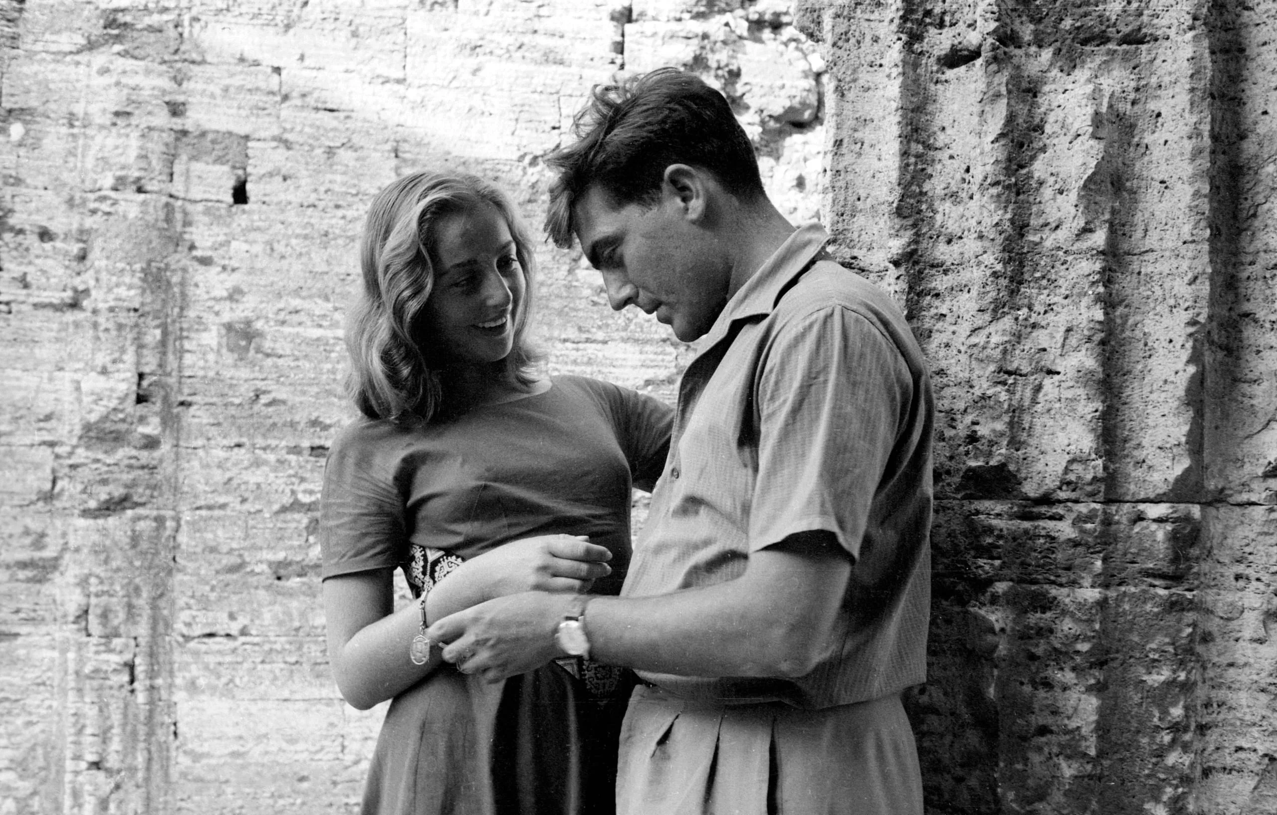 Black and white photograph of a young man and woman standing close together against a rough stone wall, she looks toward him with lips parted, he looks down at their joined hands