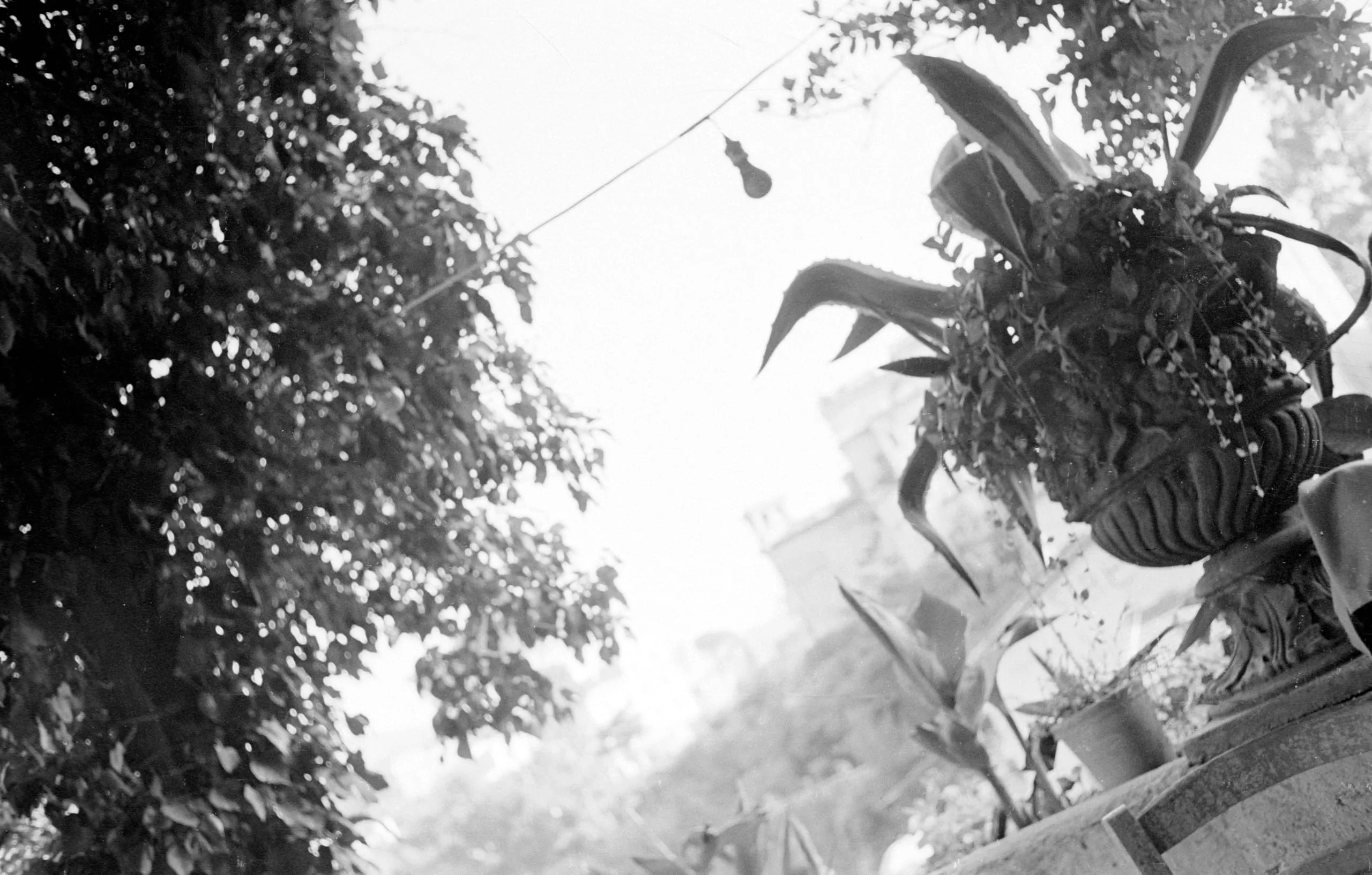 Black and white photograph shot from ground level looking up, with a leafy tree to the left, a large decorative stone planter filled with broad-leafed plants to the right, and a bright overexposed sky at center