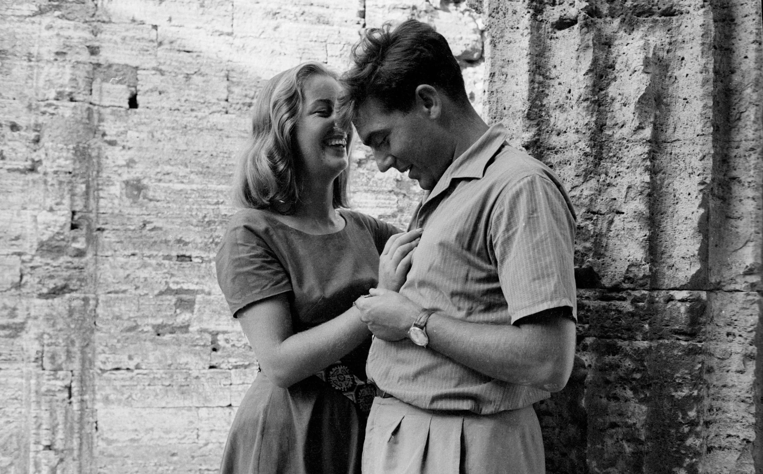 Black and white photograph of a man and woman standing close together, smiling, against a rough stone wall