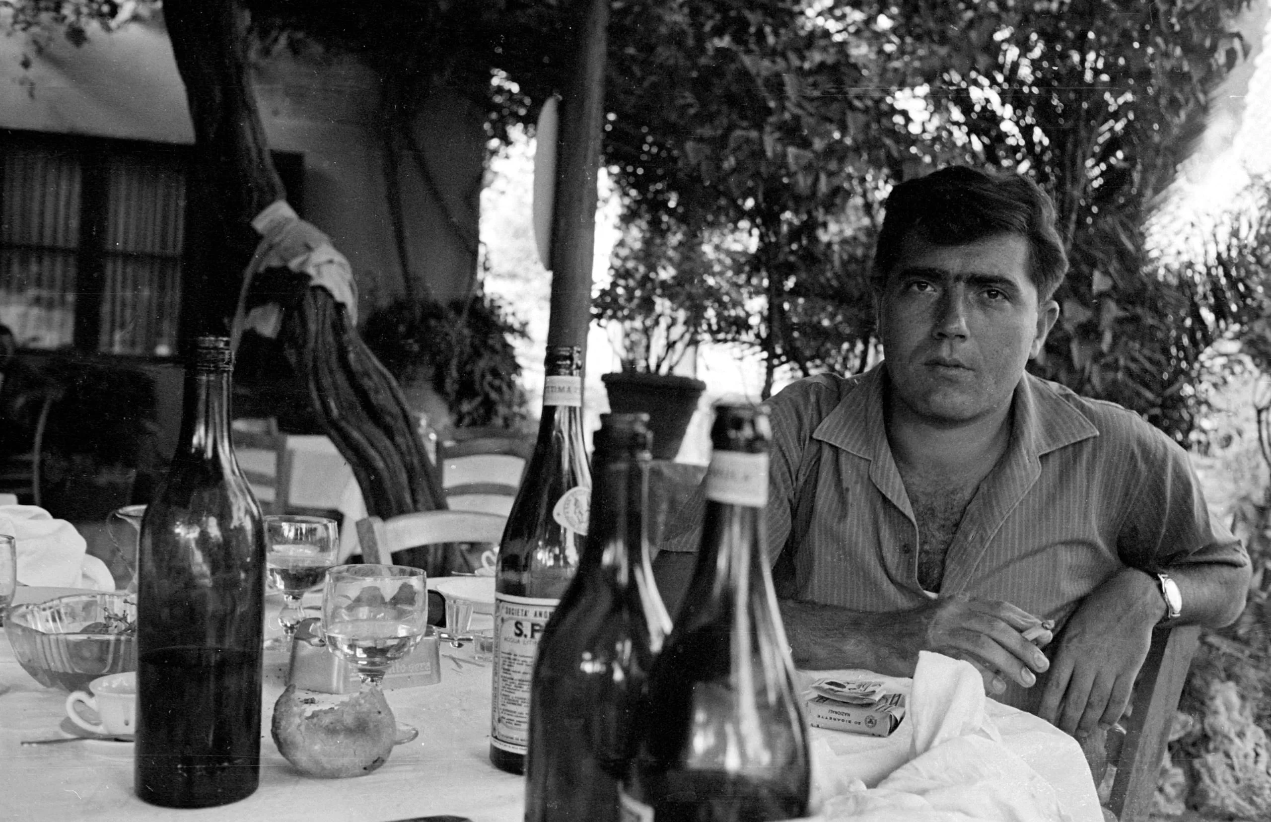 Black and white photograph of a dark-haired man seated at an outdoor café table scattered with wine bottles and glasses, looking to one side