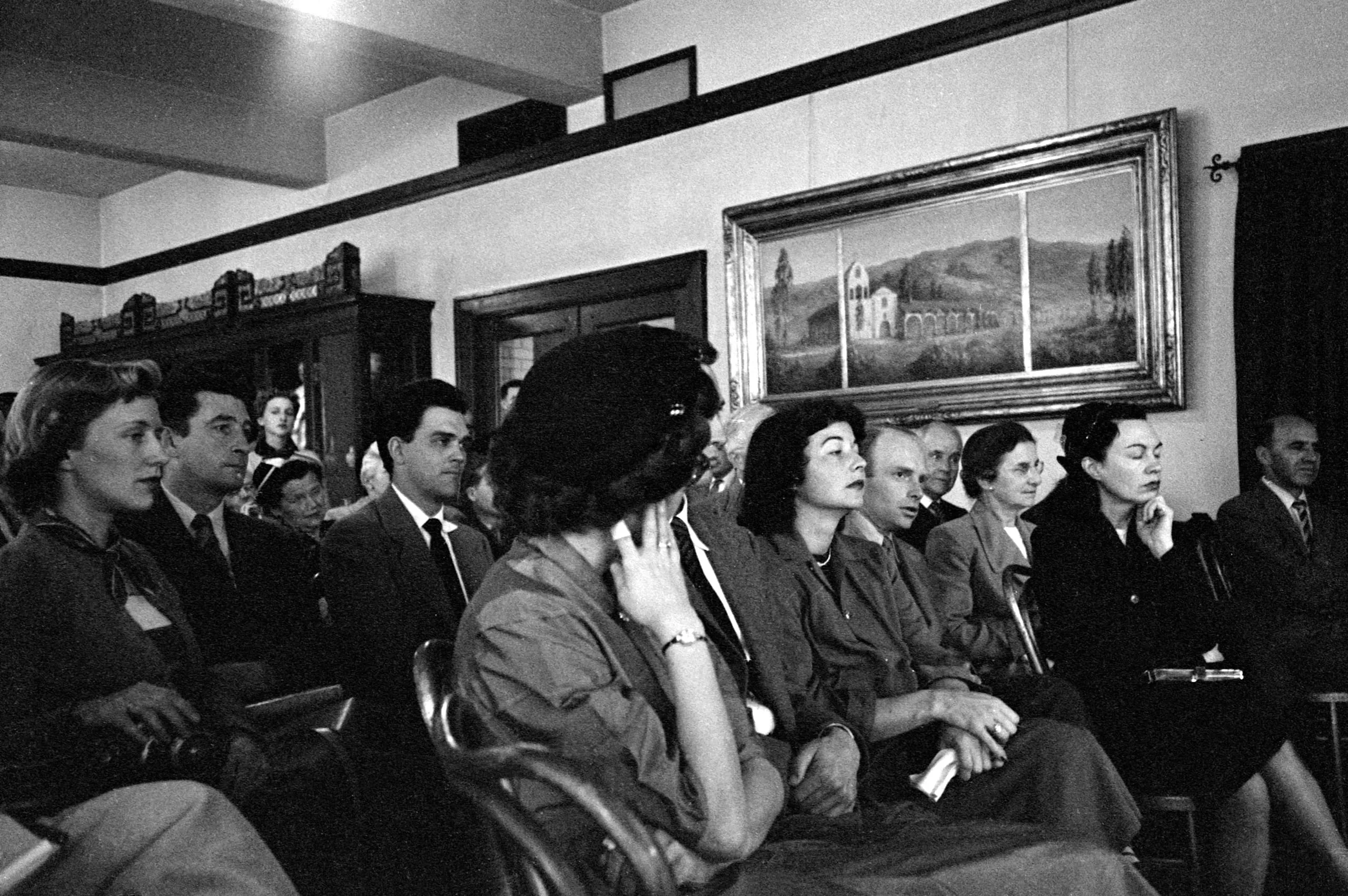 Black and white photograph of a row of adults seated in chairs inside a room, all looking to one side, with a framed landscape painting on the wall behind them