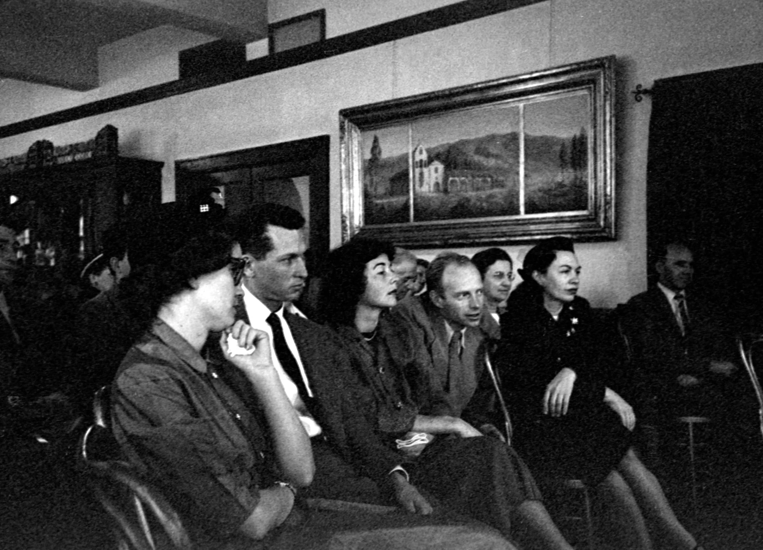 Black and white photograph of a row of men and women seated in chairs, all looking to the left, with a framed landscape painting on the wall behind them