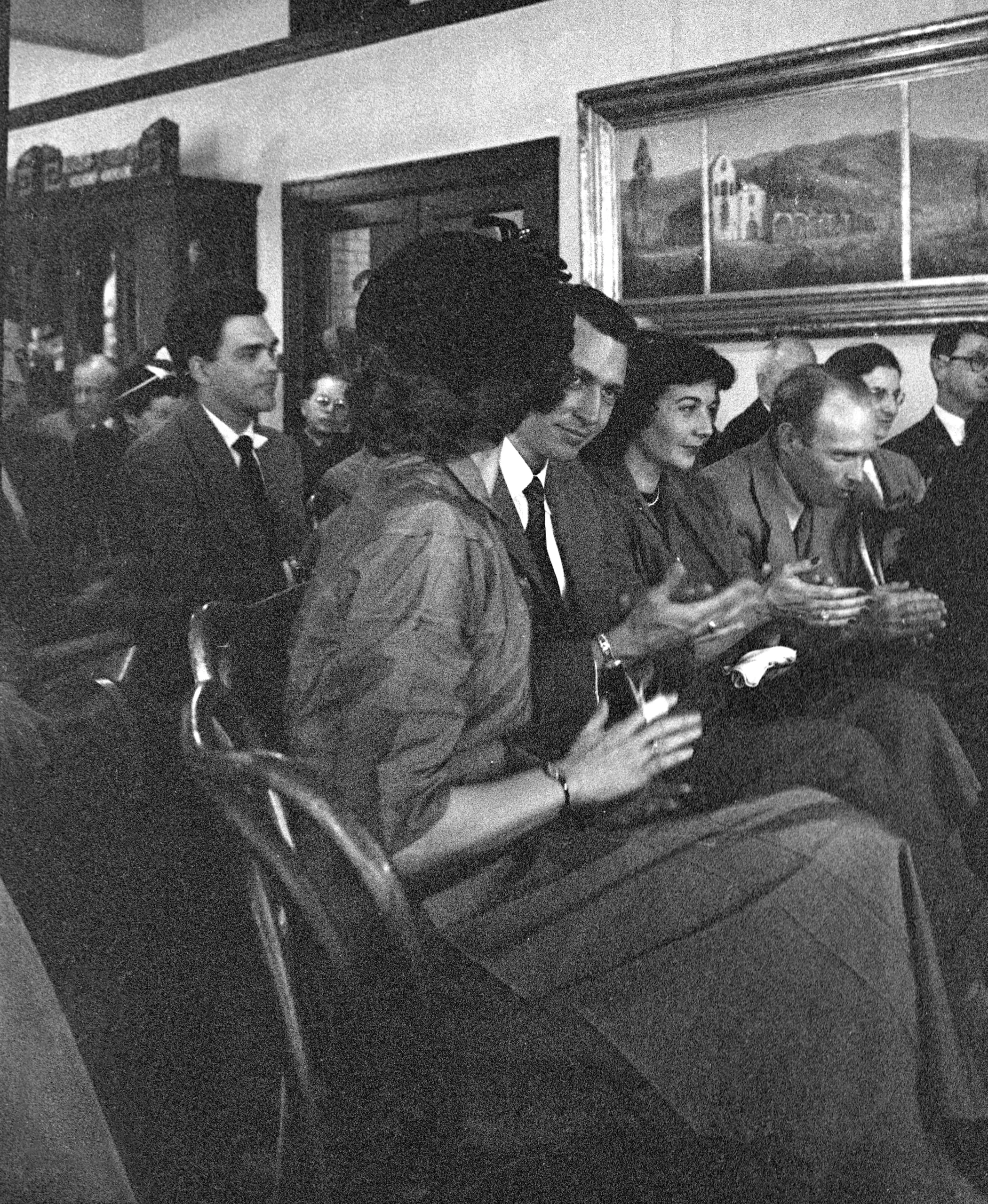 Black and white photograph of a row of seated adults at an indoor gathering, with a framed landscape painting visible on the wall behind them