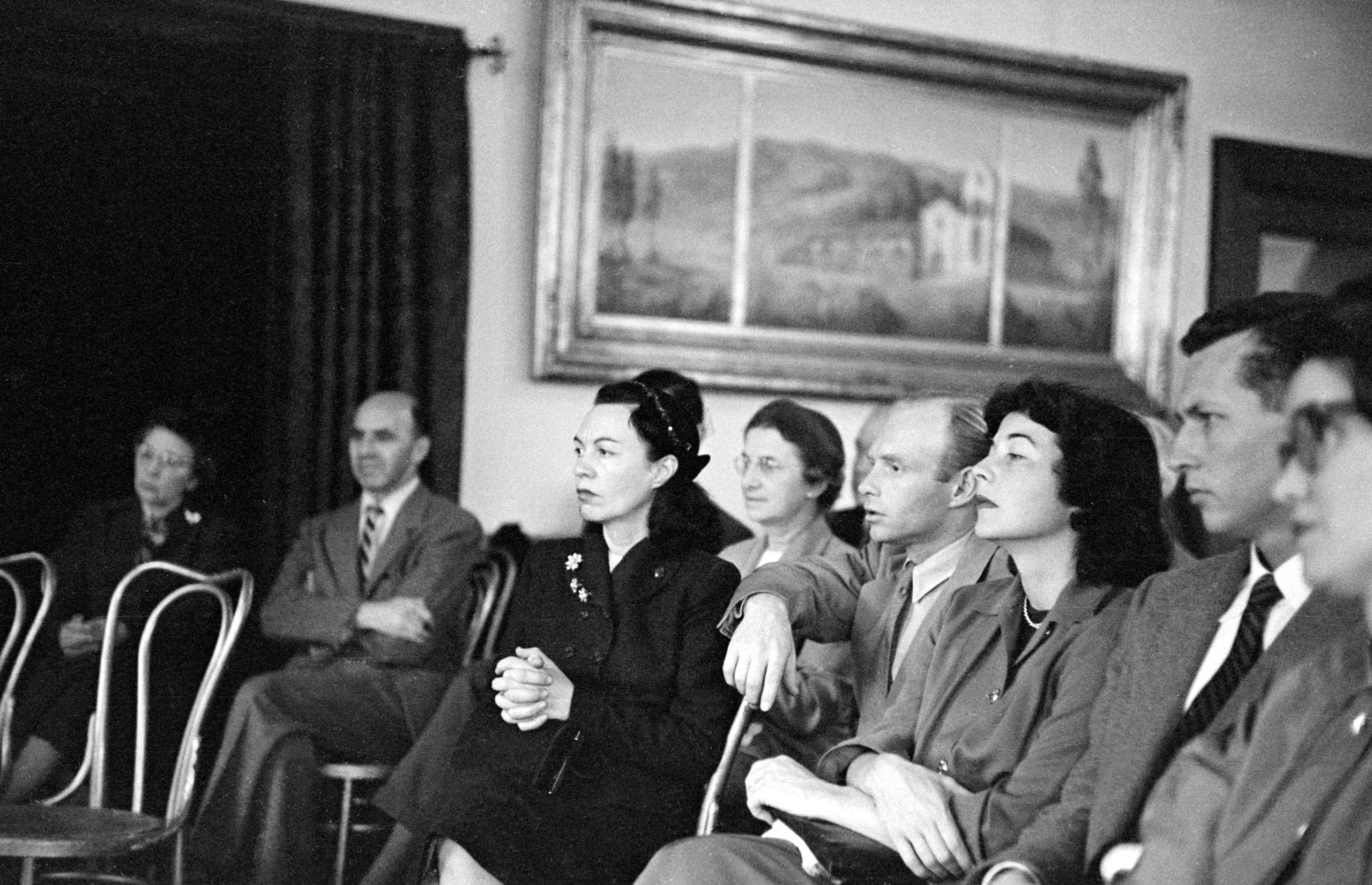 Black and white photograph of eight people seated in a row of bentwood chairs, all looking to the right, with a framed landscape painting on the wall behind them