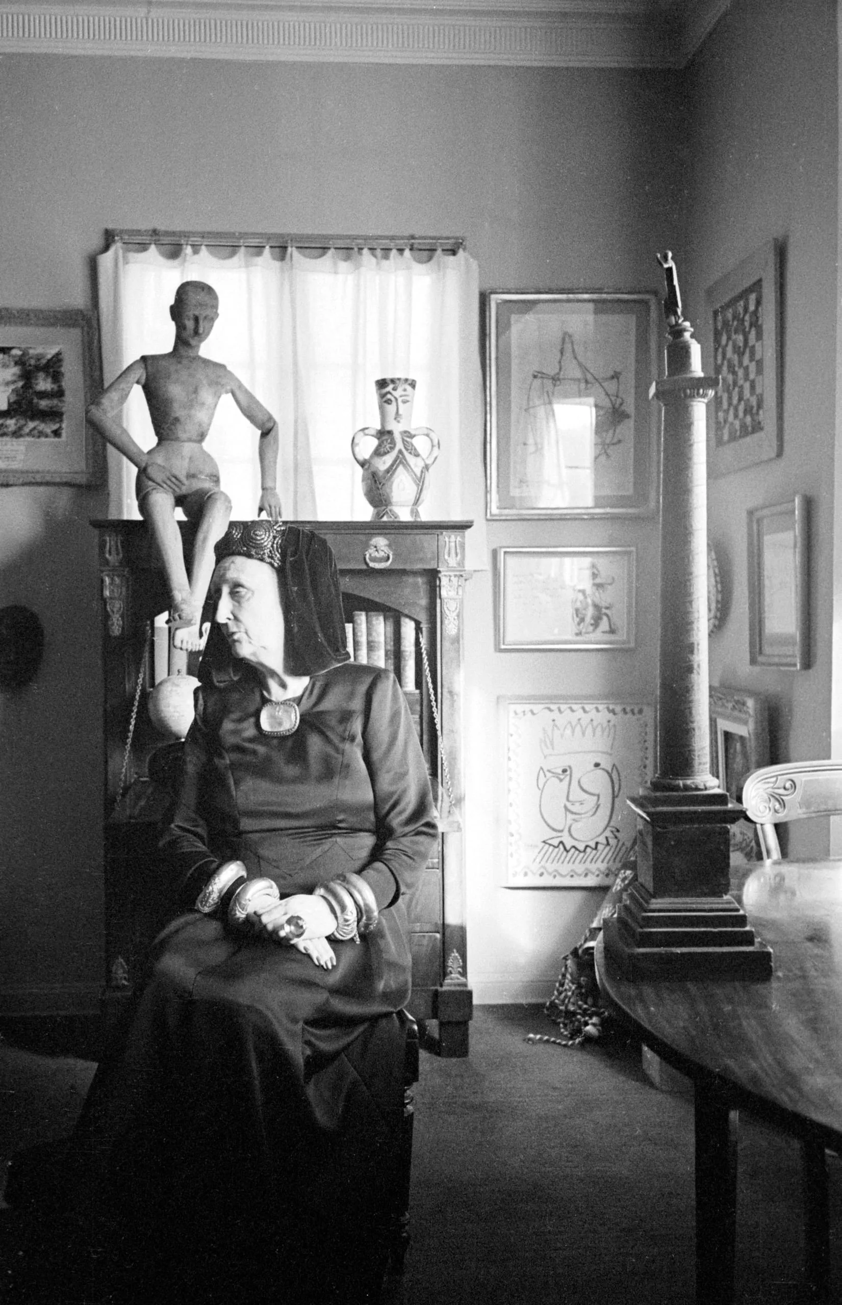 Black and white photograph of an older woman seated in a chair wearing a crown-like headpiece and silver jewelry, surrounded by sculptures, framed drawings, and objects in a cluttered interior