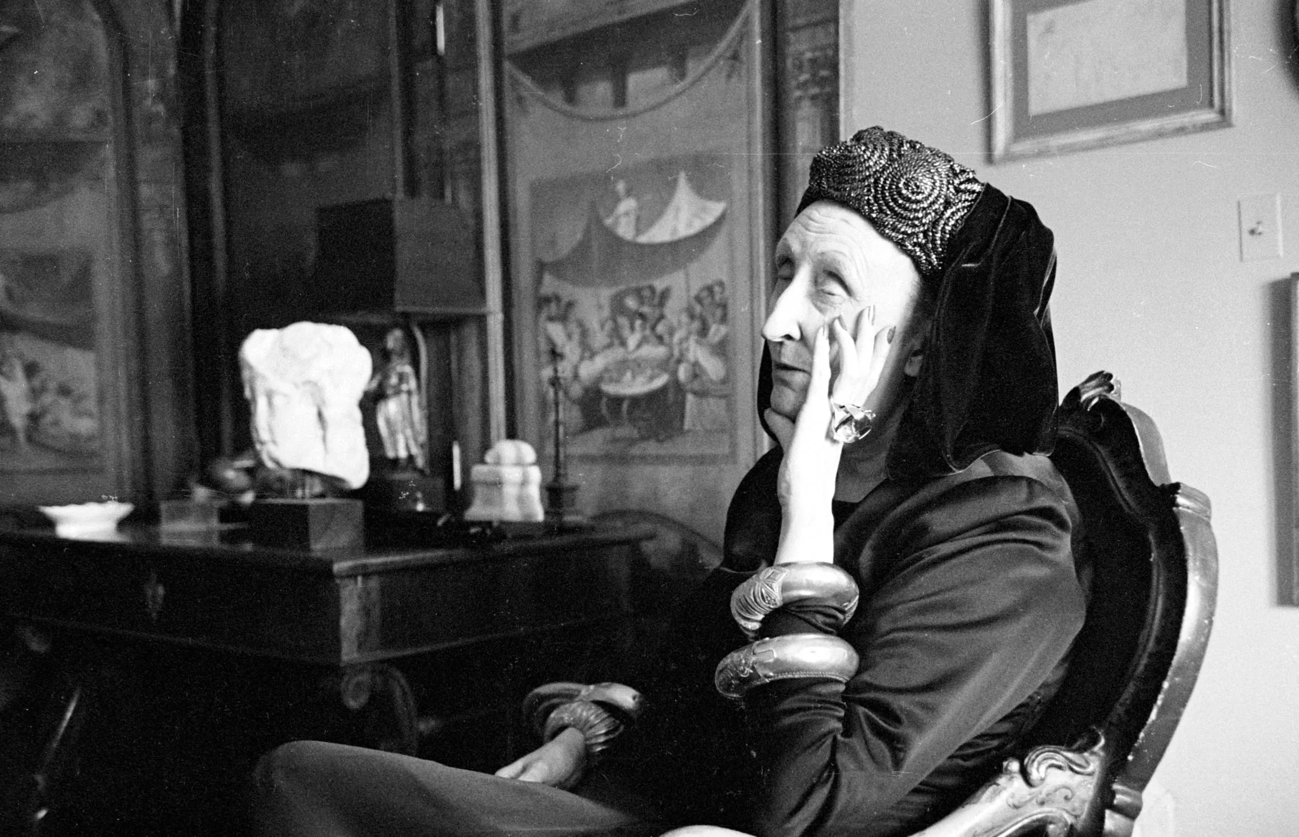 Black and white photograph of an older woman in a dark velvet hood and beaded cap, seated in an ornate chair with one hand raised to her cheek, surrounded by antique furnishings