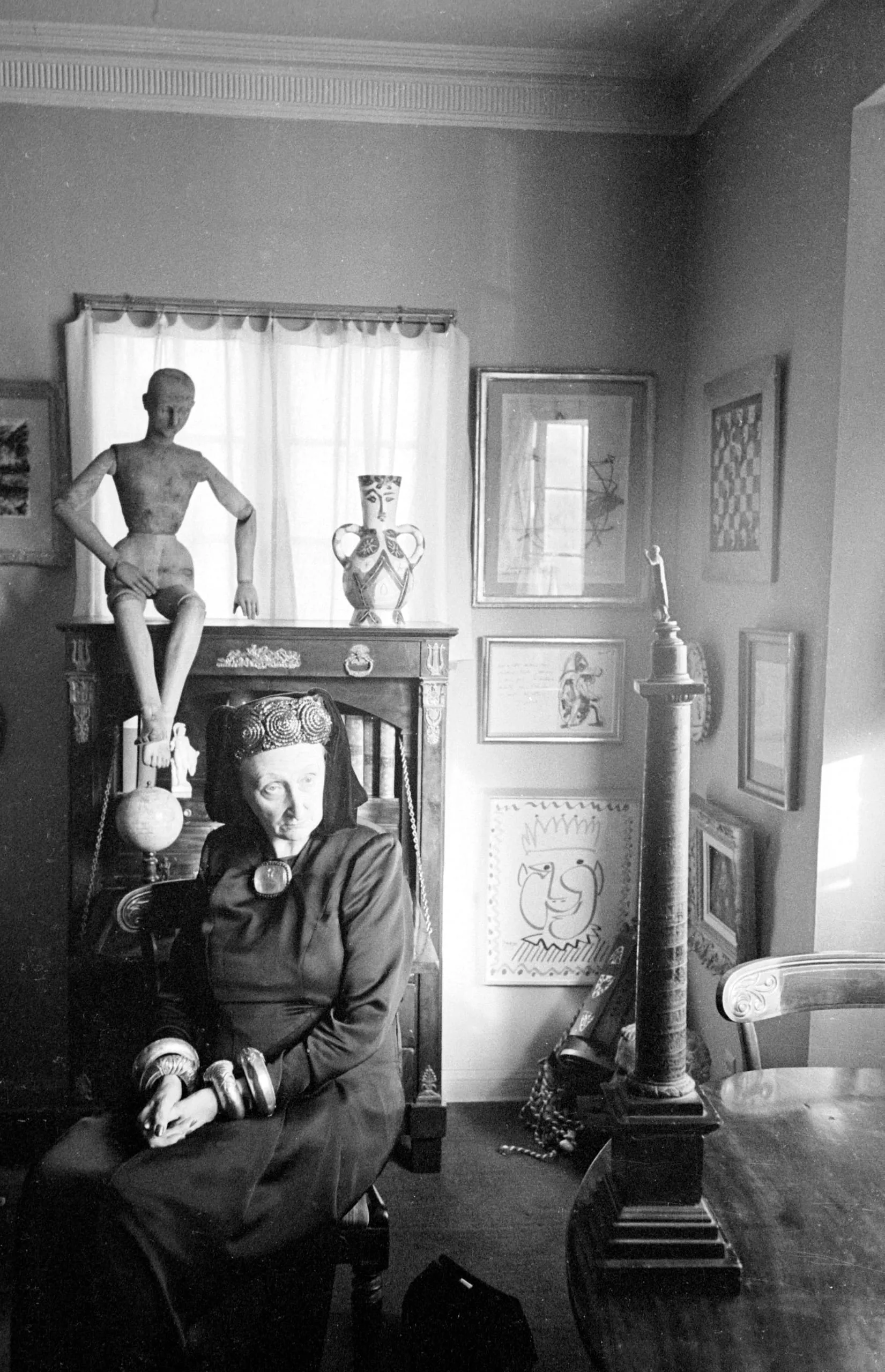 Black and white photograph of an older woman seated in a cluttered interior surrounded by framed artworks, sculptures, and decorative objects