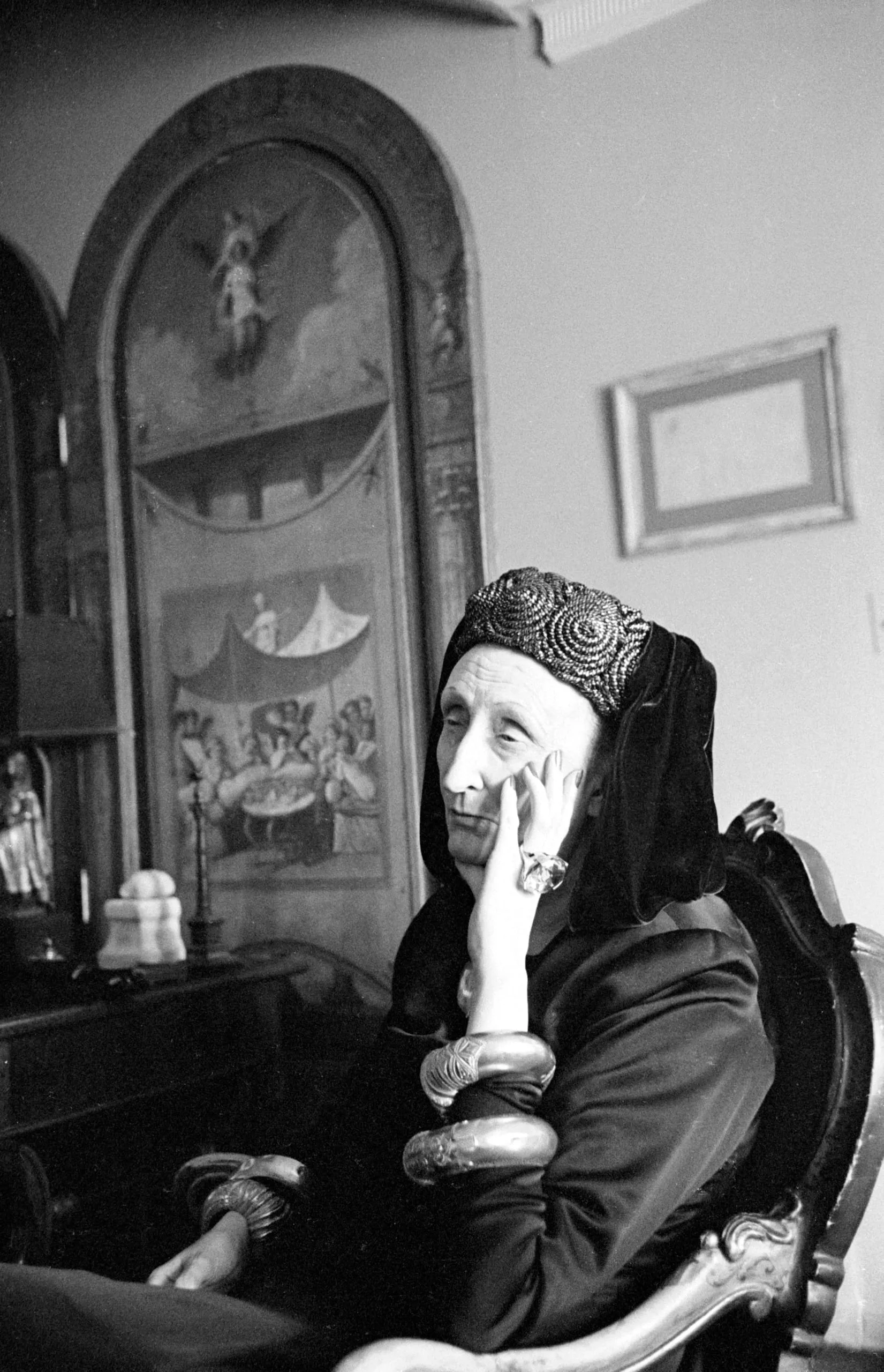 Black and white photograph of an older woman in a dark velvet head covering and beaded cap, seated in an ornate carved chair, resting her cheek on one hand, with stacked bangles on her wrist