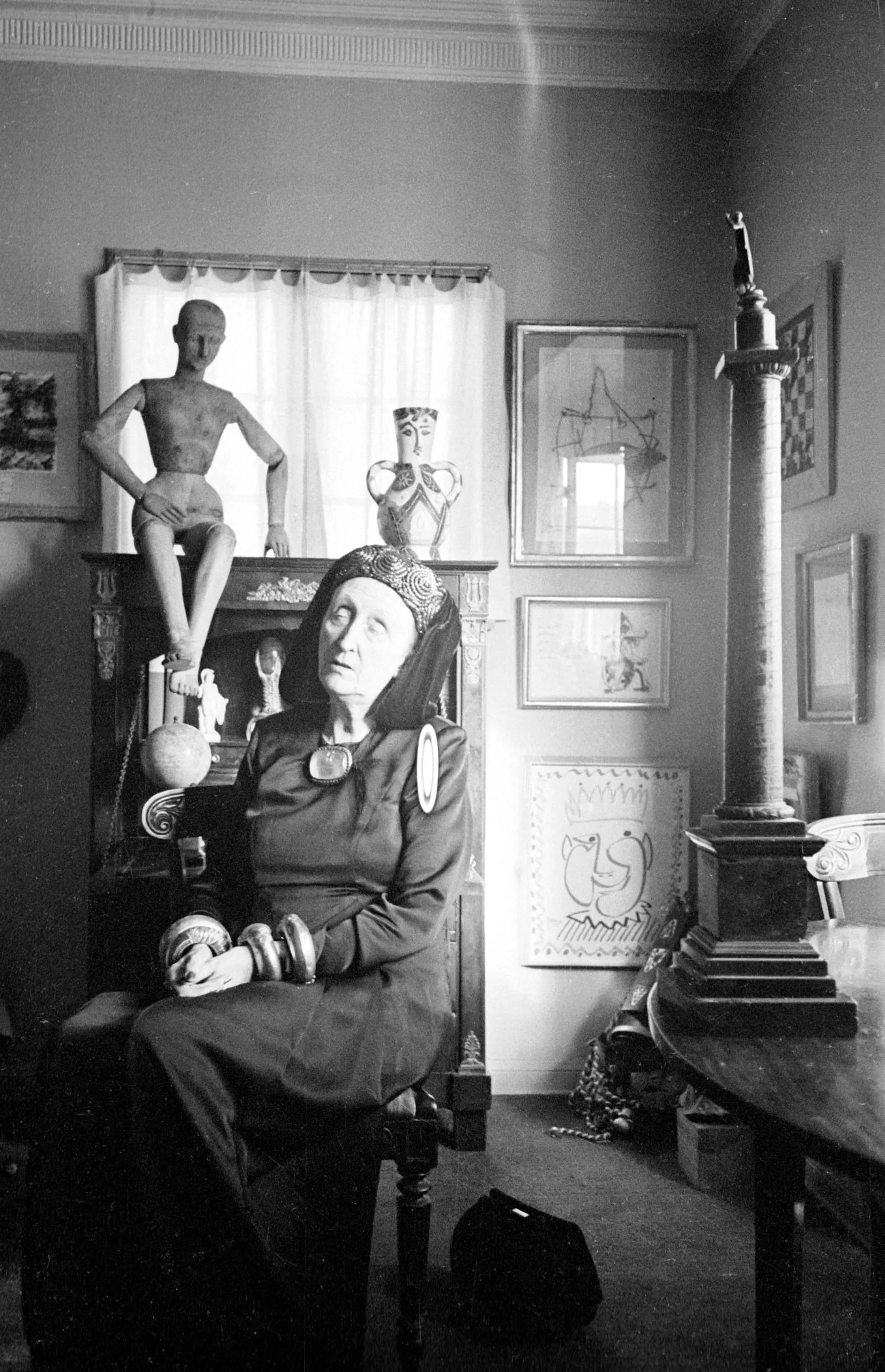 Black and white photograph of a seated woman with closed eyes and decorated headband, surrounded by sculptures, figurines, and framed artworks