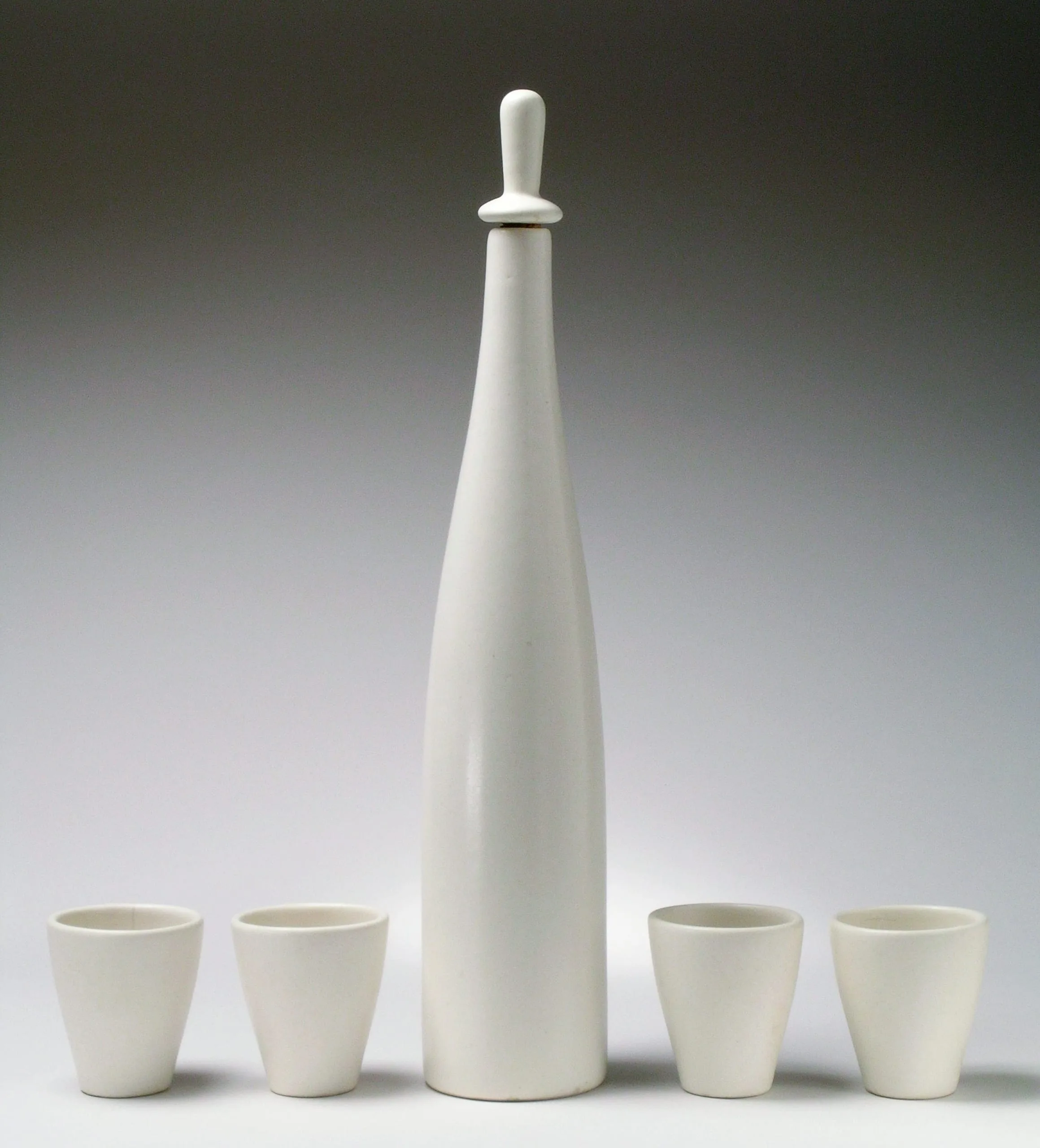 - .1) Decanter: 16 x 2 1/2 in. (40.64 x 6.35 cm); .2-.5) Cups: 2 3/4 x 2 1/2 in. (6.98 x 6.35 cm) each