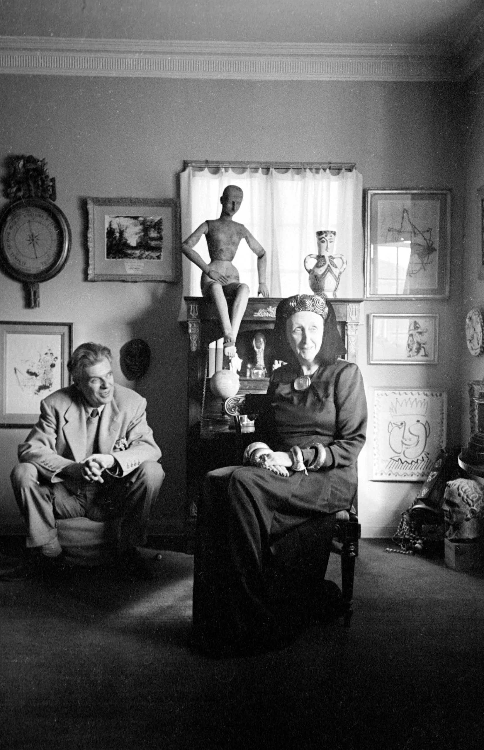 Black and white photograph of an older woman in a tiara and a middle-aged man seated in an art-filled room with sculptures and framed works on the walls