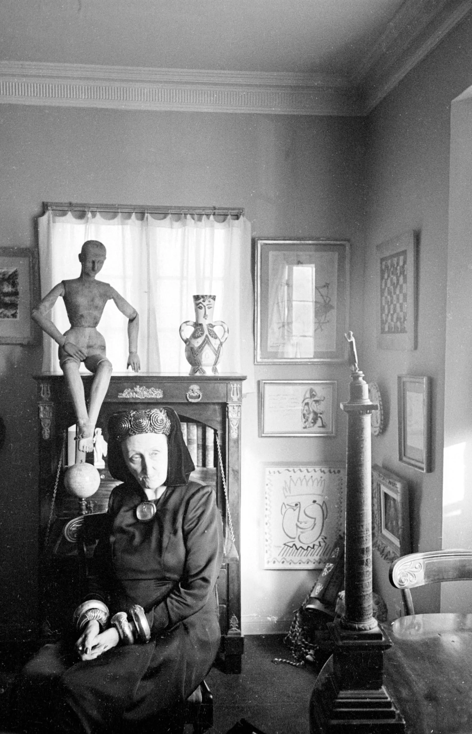 Black and white portrait photograph of a woman seated in a carved chair surrounded by sculptures, drawings, and framed artworks in a cluttered interior