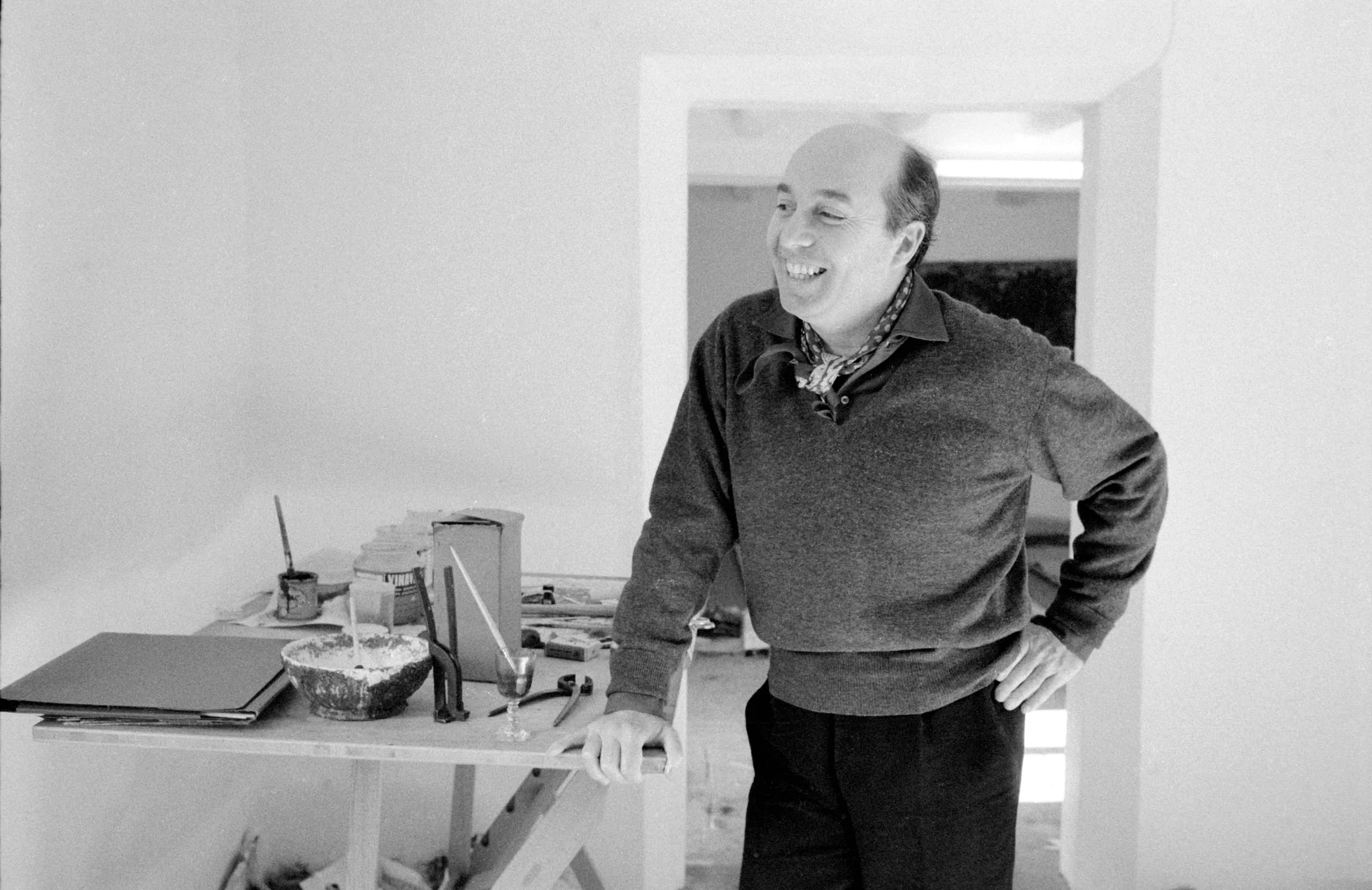 Black and white photograph of a bald white man in a crewneck sweater, laughing with head tilted back, leaning on a worktable scattered with art tools in a white-walled studio