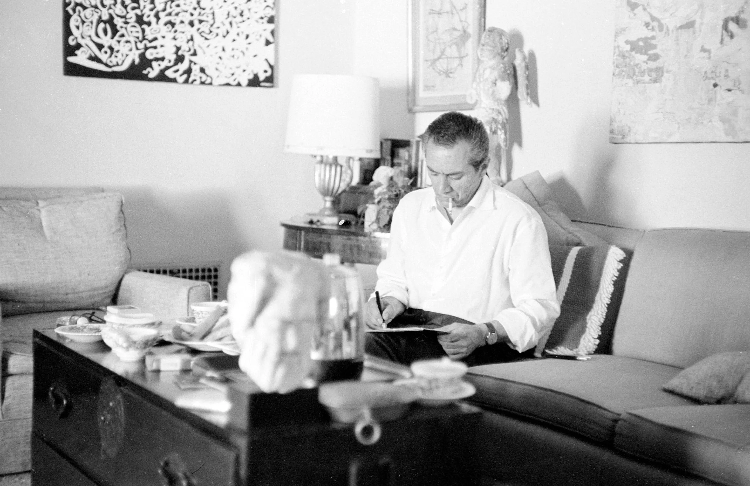 Black and white photograph of a man in a white shirt sitting on a sofa, looking down at an open folder, with a cluttered coffee table in front and abstract artworks on the wall behind him