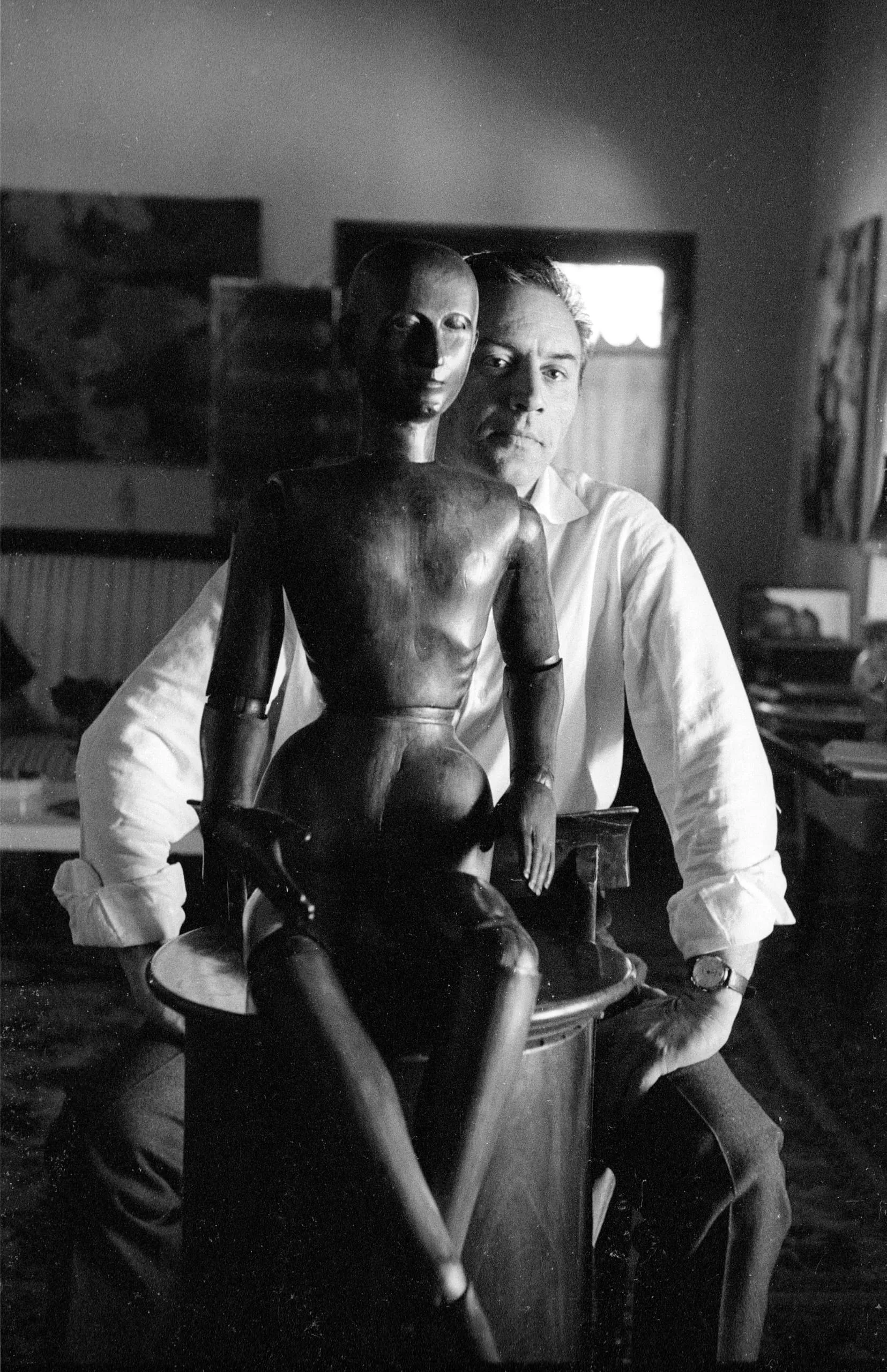 Black and white photograph of a man in a white shirt seated behind a dark wooden artist's mannequin in a studio interior, both facing the camera