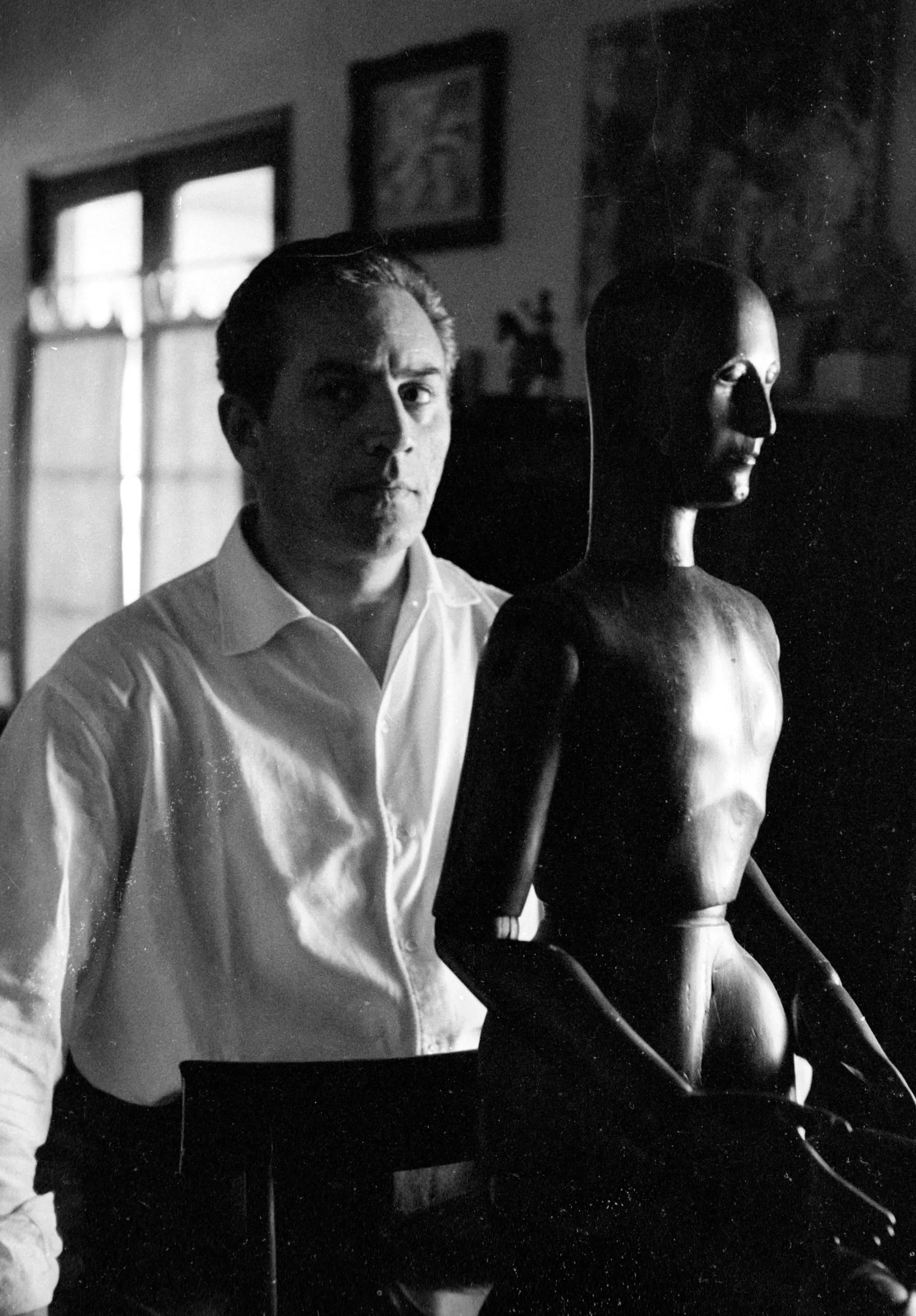 Black and white photograph of a man in a white shirt standing beside a wooden artist's mannequin in profile, with dramatic directional lighting