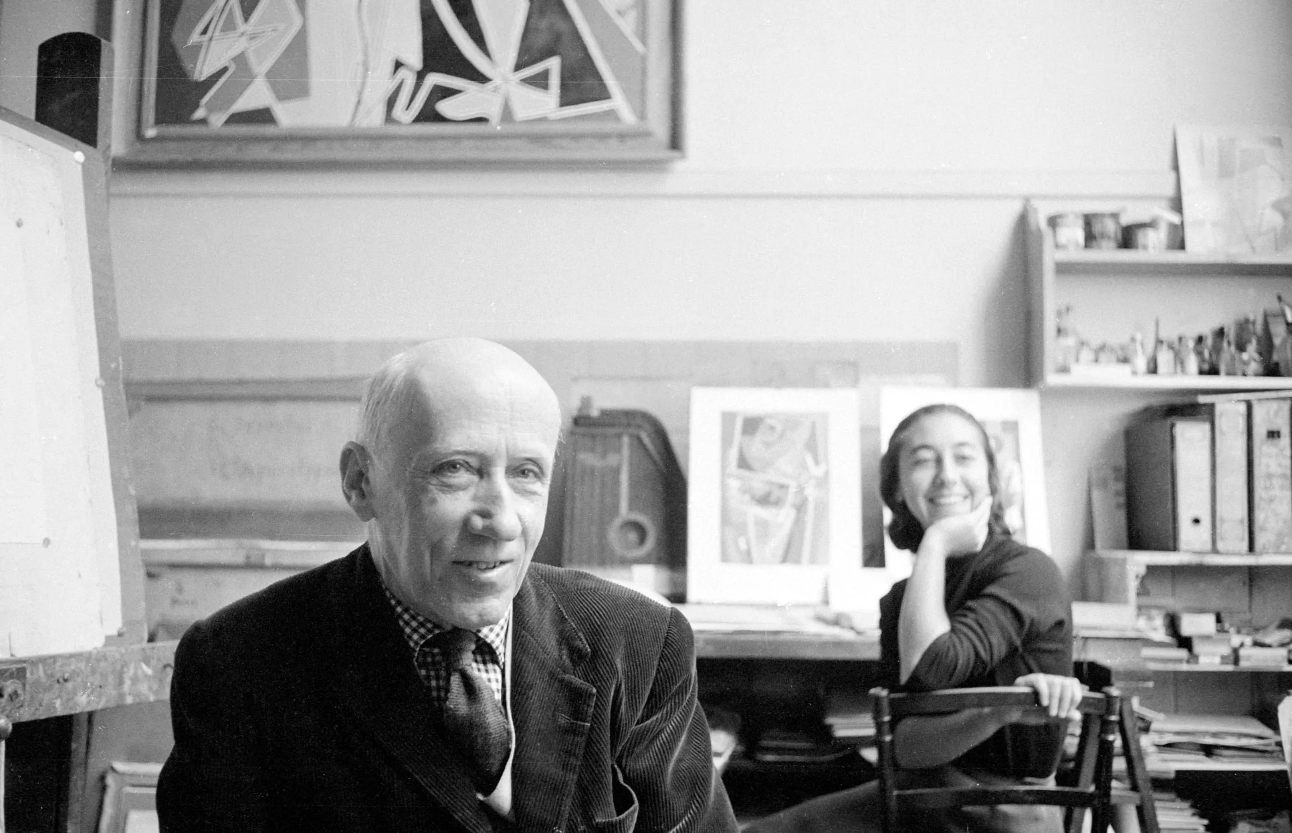 Black and white photograph of an older bald man and a younger dark-haired woman seated in an artist's studio, with framed artwork and supply shelves visible behind them