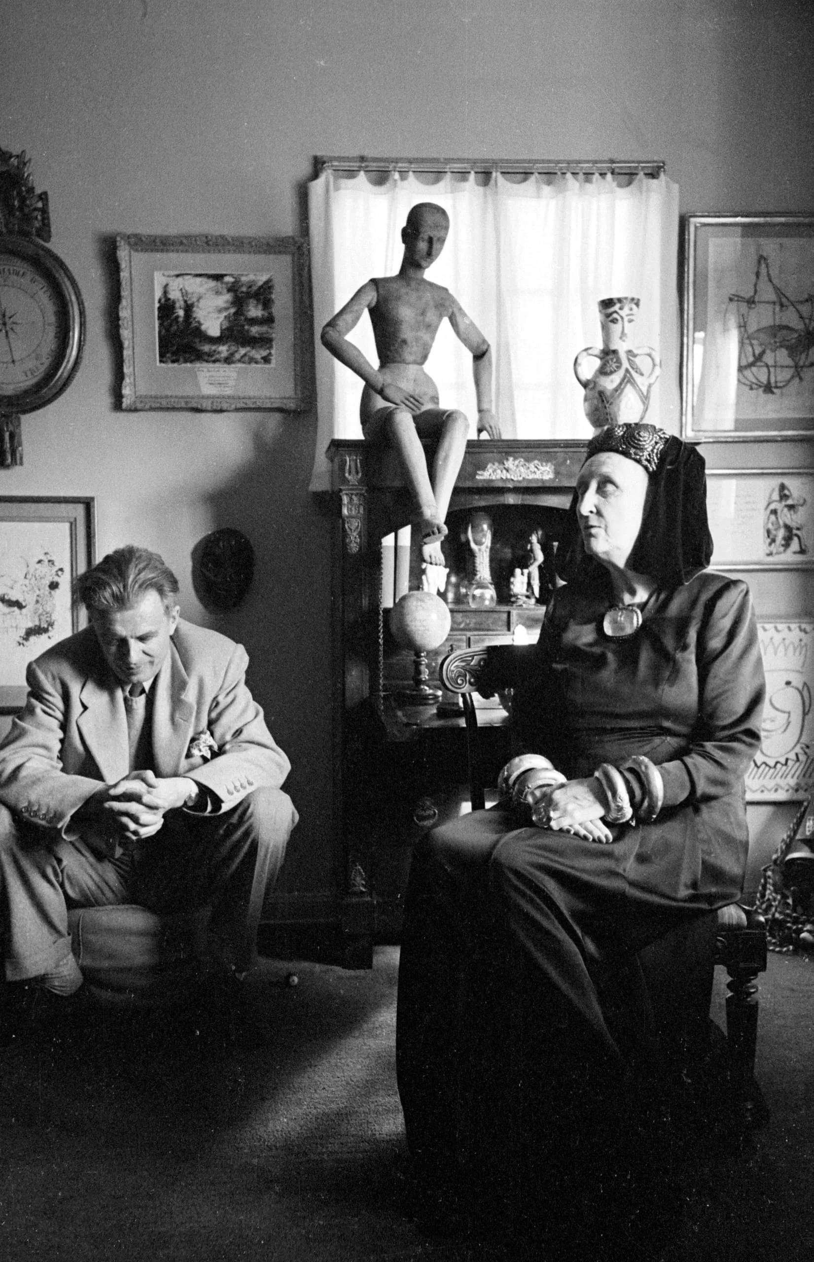 Black and white photograph of two people seated in an art-filled room, with carved wooden and ceramic figurines on a cabinet behind them