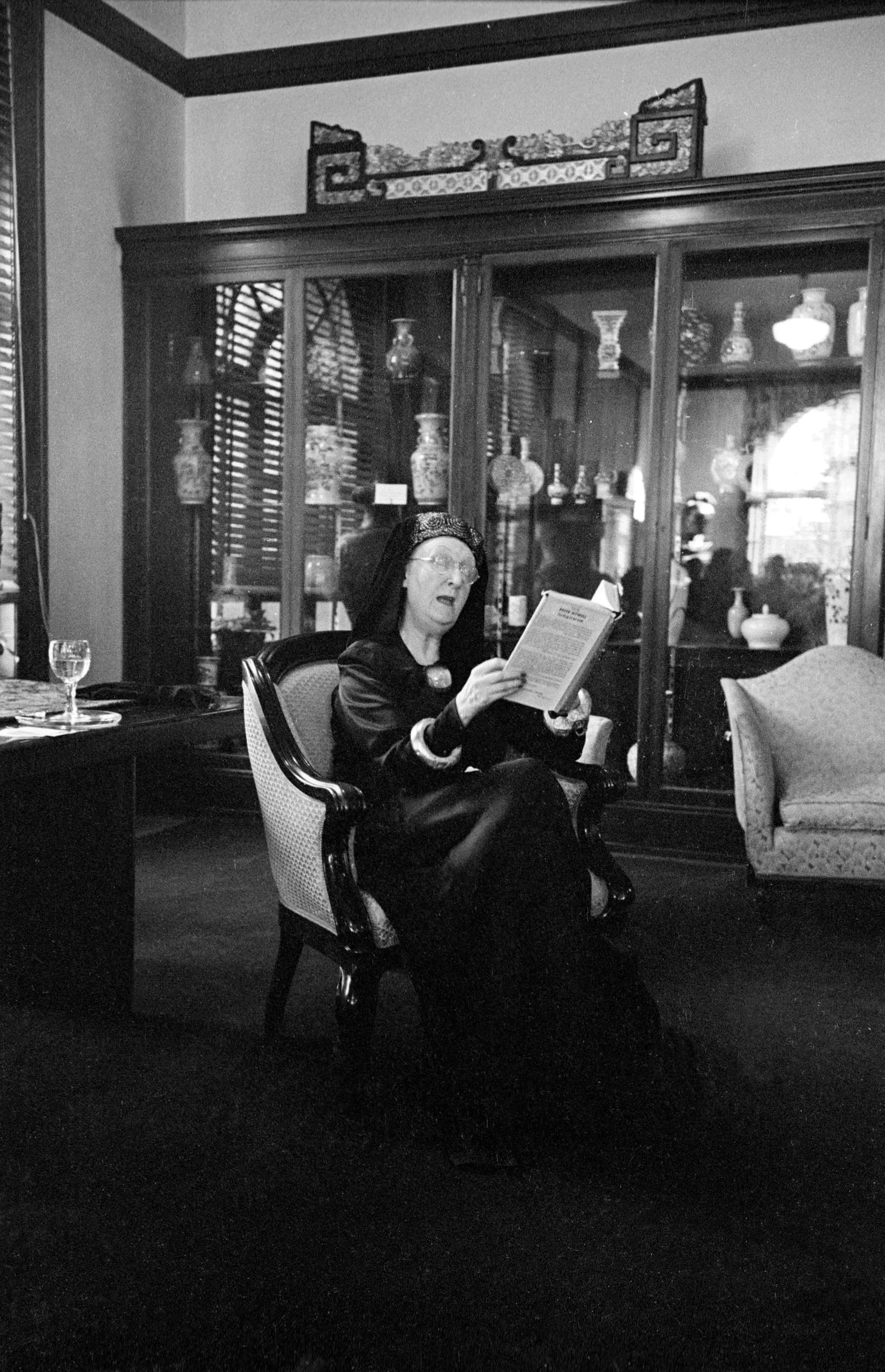 Black and white photograph of a woman in a dark robe and turban seated in an armchair, mouth open, reading a pamphlet, with a lit display cabinet of ceramic vessels behind her