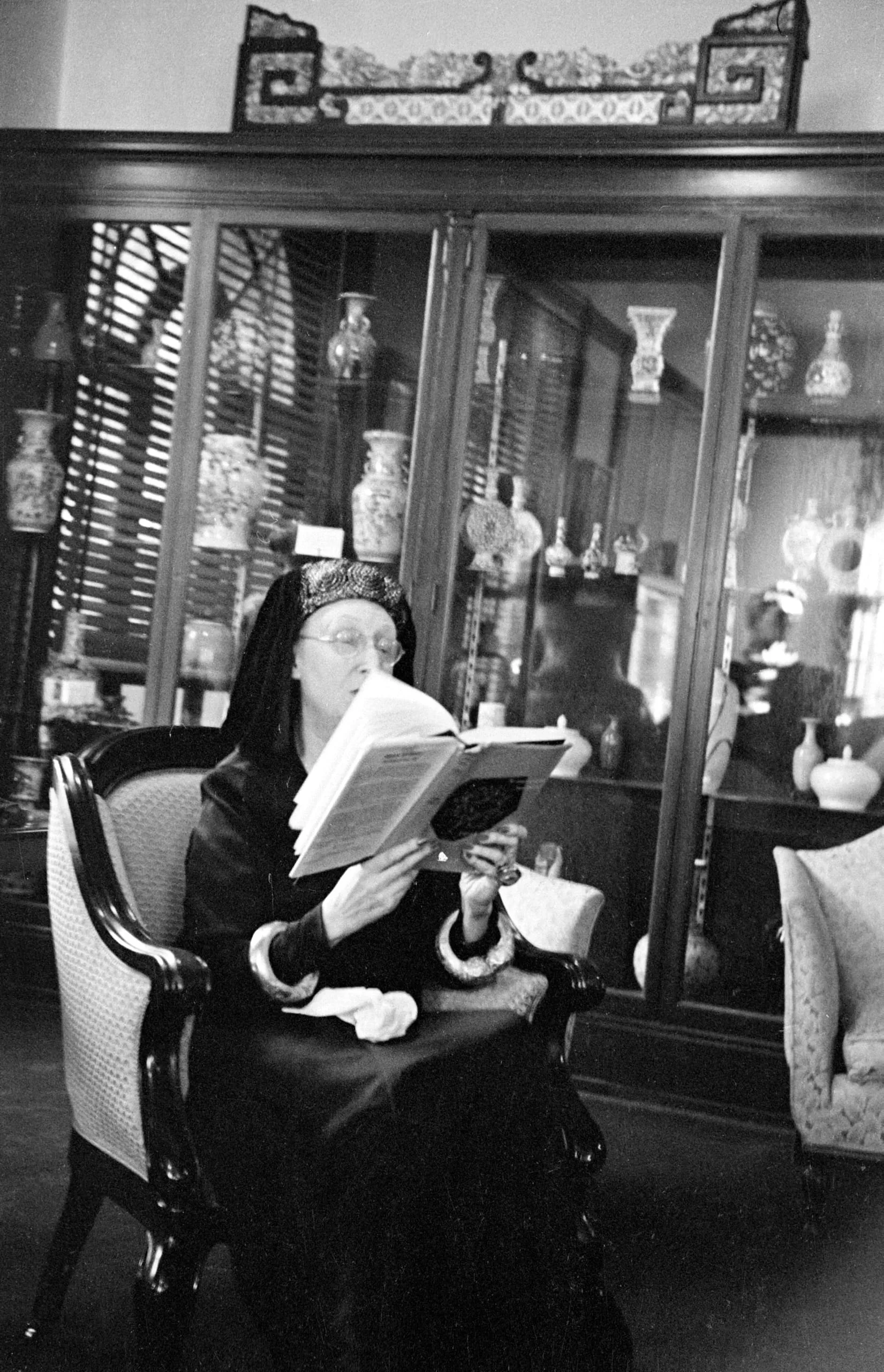 Black and white photograph of a woman in a dark dress and glasses seated in an armchair, reading an open book in front of her face, with a glass-fronted display cabinet of ceramics behind her