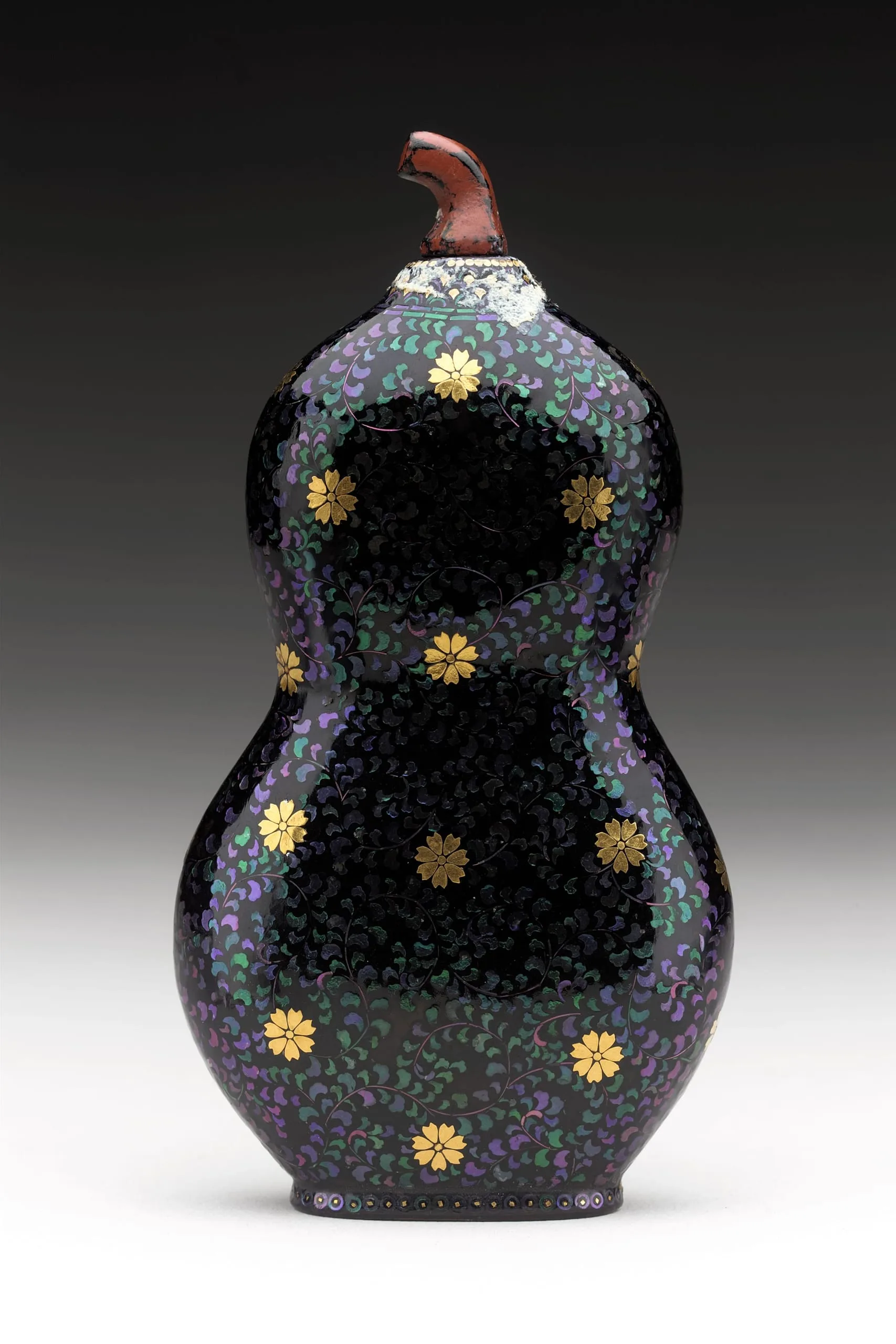 - Black lacquer on wood core with mother-of-pearl and gold leaf inlay, with lacquered wood stopper