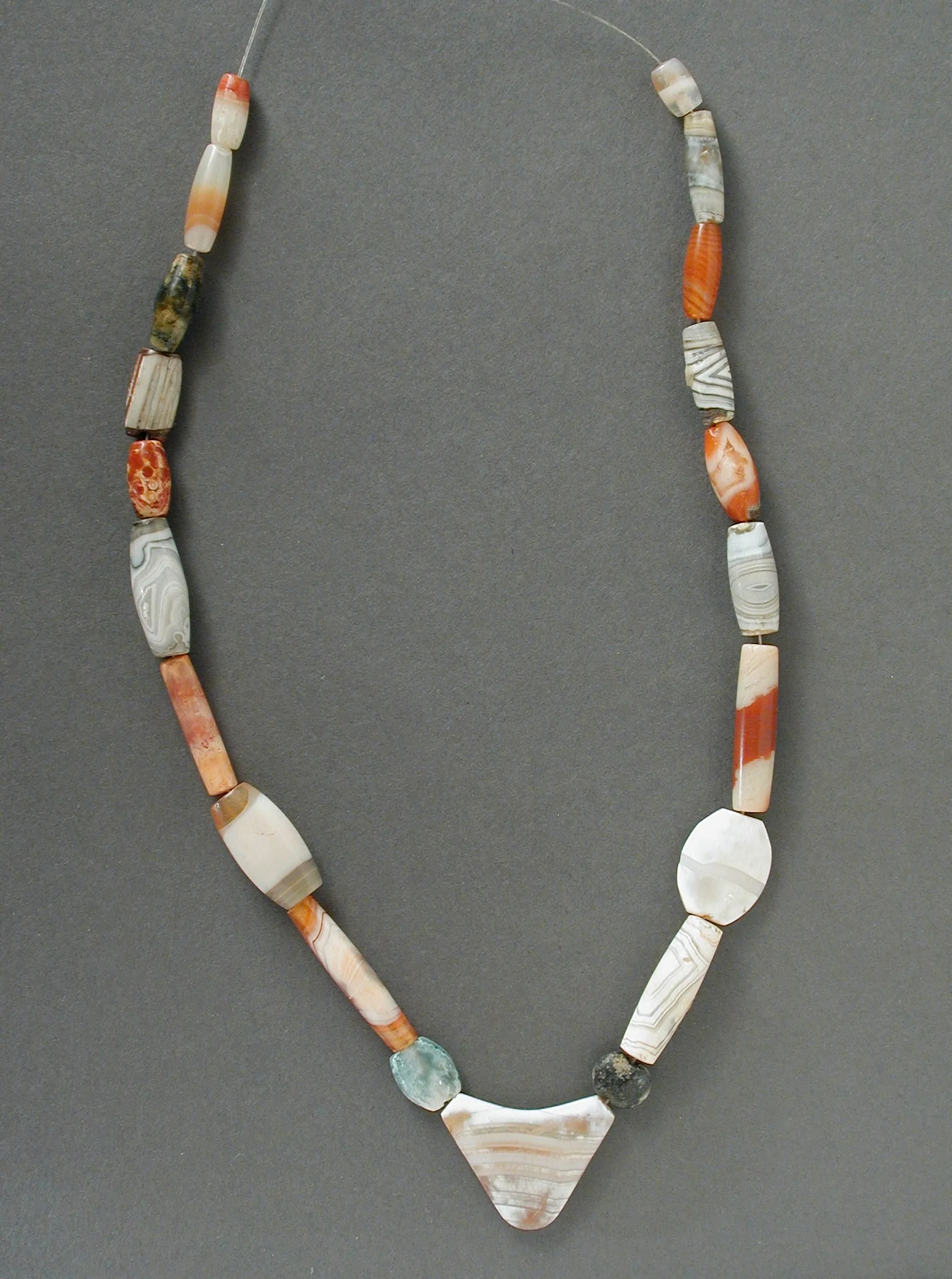 Strung necklace of polished agate and stone beads in rust-orange, cream, and gray, with a flat triangular pendant at center, displayed on gray background
